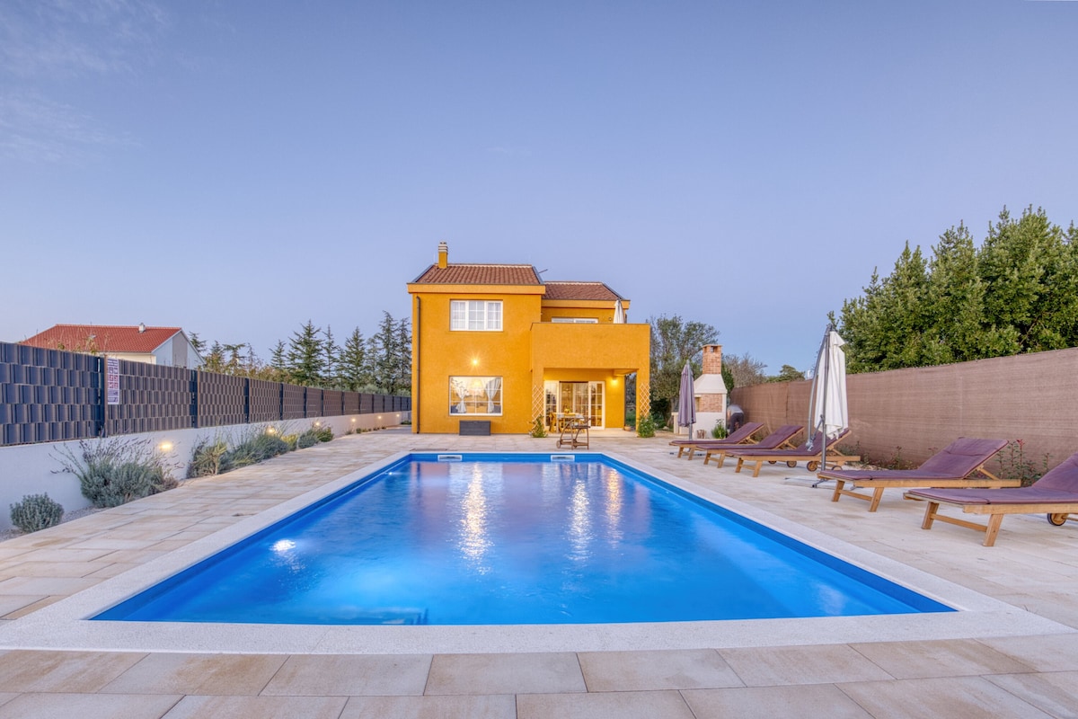 This new villa is located in the center of town and near the beach. The house consists of three bedrooms, living room with dining room, fully equipped kitchen, three bathrooms, terrace, private pool and parking. All rooms are air-conditioned and two bedrooms have their own bathroom. Nearby is the historic town of Nin and a famous sandy beach. Our guests have free WiFi and a barbecue.