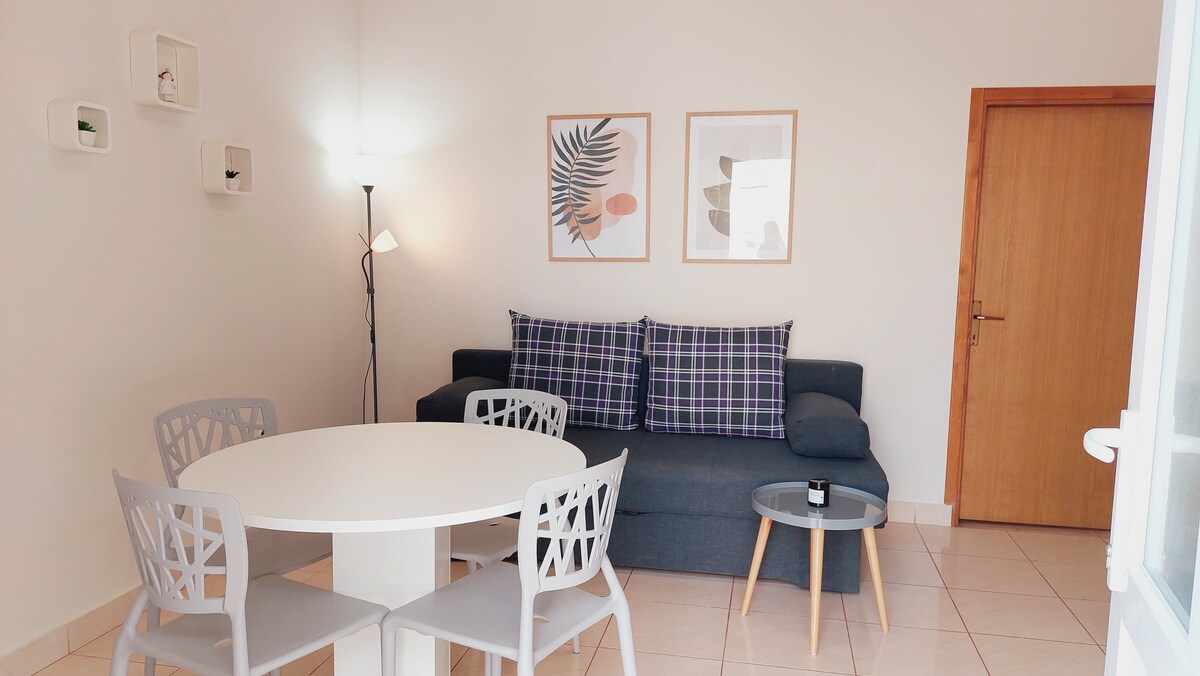 Modern, family-friendly apartment just 300m from the beach. Features a bright, white interior, 2 bedrooms (luxurious box-spring bed + twin beds), private dining area, terrace with grill, and access to a shared stone-grill tavern. Free bikes, scooters & toys for kids. Large green yard for play. Quiet location – perfect for families seeking relaxation and comfort.