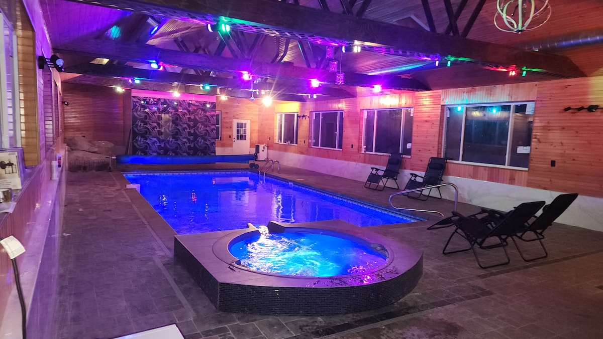 This unique specious and tranquil getaway private home includes an indoor heated swimming pool, hot tub, an outdoor space of 34 acres for you to enjoy nature, work out equipment, movie theater. Complete eat in kitchen, outdoor grill. washer and dryer, three bathrooms. Huge open space basement equipped with LED changing color light. Rooms have Wi-Fi LED light to connect music. The place sleeps 8 guests, in beds. Two additional twin mattresses.16 guests maximum. Hot tub take a while to heat up.