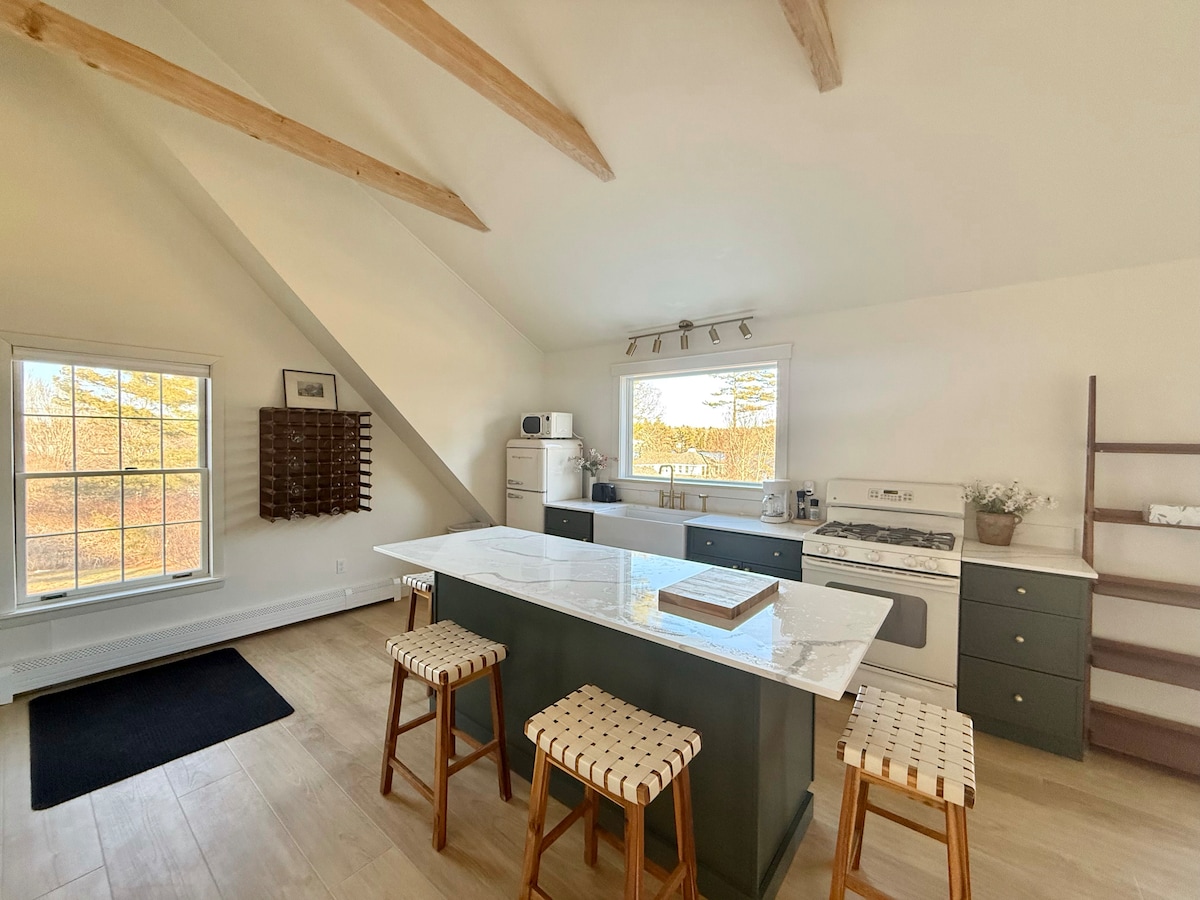 Isang lofted bed space na may karagdagang opsyonal na pull out couch na nilagyan ng ergonomic foam mattress. Ang lugar na ito ay may air conditioning pati na rin ang init at kamangha - manghang natural na liwanag. Tatak ng bagong banyo na may rain shower head! Isang kumpletong kusina na may mini refrigerator, hiwalay na espasyo ng freezer, oven, kalan at mga kagamitan sa kape/tsaa. May gitnang kinalalagyan sa Brunswick, at tahimik! Sa tapat mismo ng Whittier Field ng Bowdoin, at 10 minutong lakad papunta sa Maine Street.