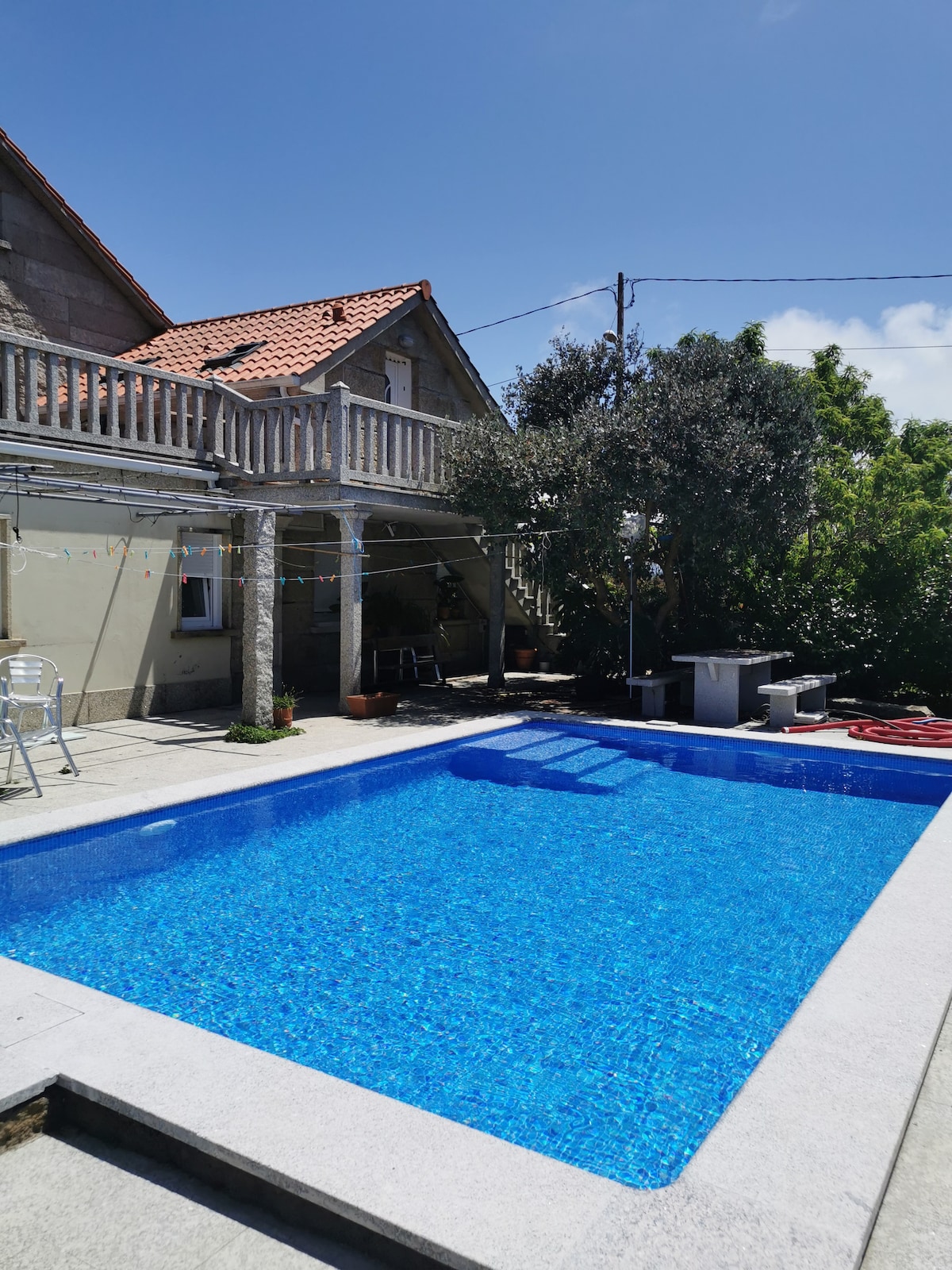 Bahay na may bagong gawang pool, na matatagpuan sa Cobres, na may tanawin ng karagatan. Napakatahimik na lugar, sa harap ng San Simón Island. 5 minutong lakad papunta sa beach. 10 min. mula sa Vigo, at 15 minuto mula sa Pontevedra. Maraming restaurant at amenidad sa malapit. Sa tabi ng La Reelyn de Cobres. Maluwag na hardin na may mga armchair at mesa sa labas. 6 km ang layo ng Domaio Golf Course.