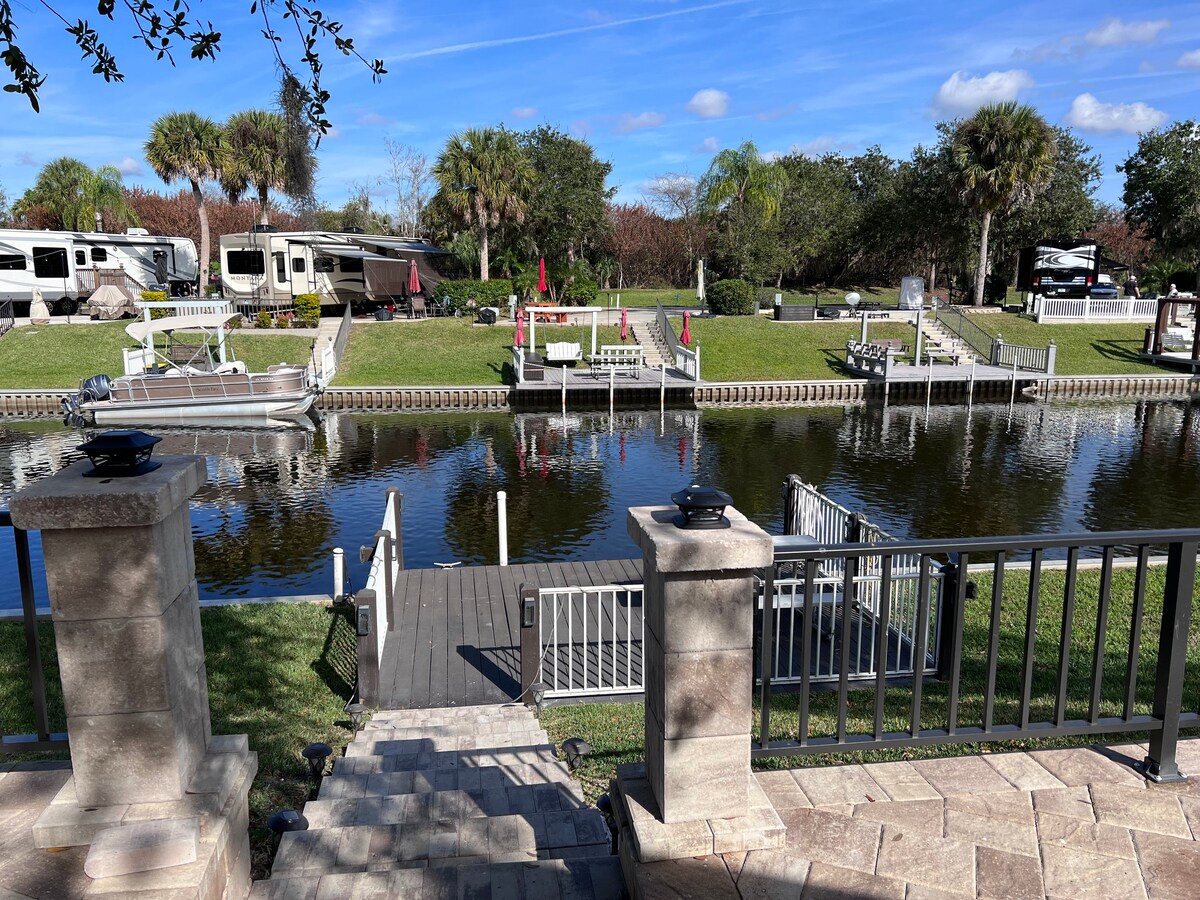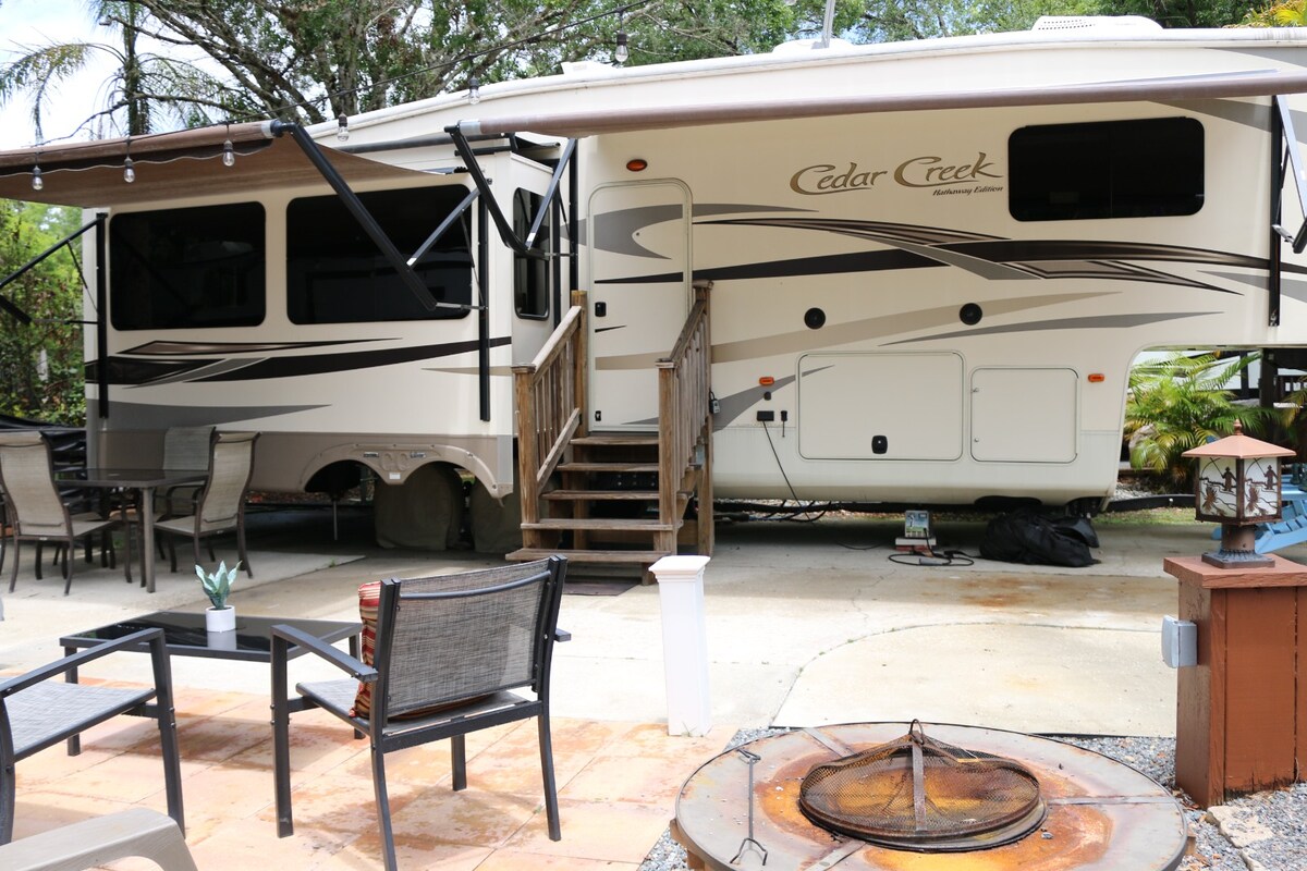 Matatagpuan ang komportableng camper na ito sa isang maliit na bayan. Matatagpuan ito nang may tanawin ng Lake Reedy na isang lawa ng pangingisda at malapit sa paglangoy sa Lake Clinch. May pampublikong boat ramp sa lawa, na hindi masyadong malayo. May 4 ft na pool, patyo sa labas, ihawan na de‑gas, mga bisikleta, at fire pit sa property. 25 milya ang layo ng Legoland, 51 milya ang layo ng Disney, nasa gitna kami ng estado - hindi masyadong malayo sa alinmang baybayin, at 59 milya ang layo ng Universal Studios. Lahat ay nasa loob ng saklaw ng mga araw-araw na biyahe