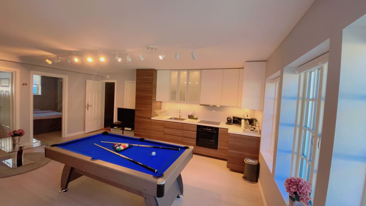 Modernong guest suite sa hiwalay na bahagi ng isang single - family na tuluyan na itinayo noong 2022. Sentral na lokasyon na may bus stop na 100 metro mula sa bahay na magdadala sa iyo sa sentro ng lungsod ng Oslo. Ang guest suite ay 28 sqm at inuupahan sa 1 -2 tao. Ang guest suite ay binubuo ng silid - tulugan/sala, malaking banyo at pribadong kusina. Nilagyan ito ng 150 cm na double bed. Kasama sa upa ang TV na may chromecast, mga tuwalya, mga linen at WiFi. 100 metro ito papunta sa hintuan ng bus na sa loob ng 20 minuto ay magdadala sa iyo sa sentro ng lungsod ng Oslo. Umaalis ang bus kada 15 minuto.