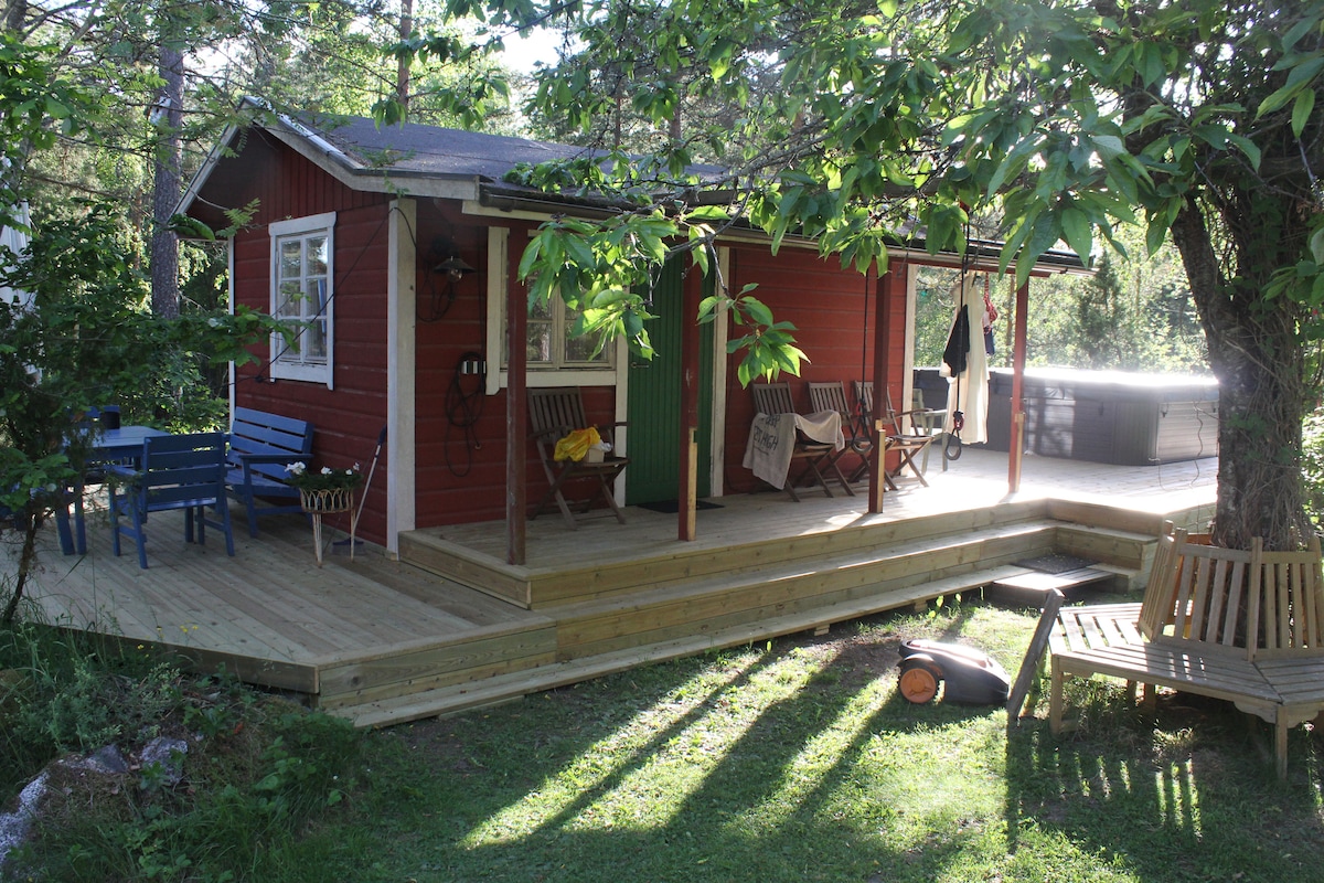 Skärgårdsidylliskt hus med stort trädäck med sjöutsikt. Delad badbrygga för sol/bad. Eldstad i huset, & stor trädgård. Möjlighet till många fritidsaktiviteter hela året. Kubbspel, badminton finns. Städning utföres av gästen. /Eng: Idyllic archipelago house for visit all seasons. Big terrace along the house towards the sea.. Shared dock/jetty for swimming/bathing. Fireplace in the house. Big lawn for relaxing. Cleaning is performed by the guest. (There are some private belongings in the house)