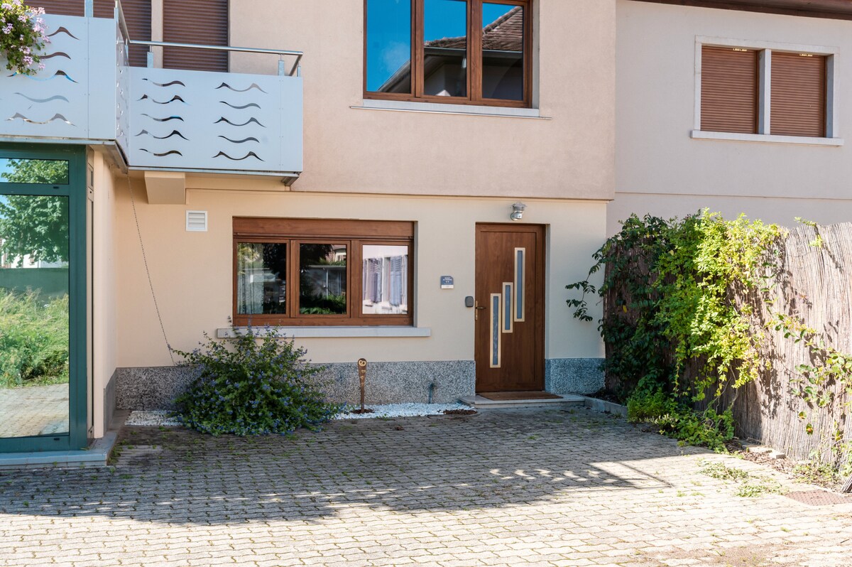 apartment 65 m², 4 na tao, 2 silid - tulugan , banyo na may mga banyo. Kusina na nilagyan ng lahat ng kailangan mo. Pribadong hardin na 170 m² at 1 pribadong paradahan. Tanawin ng buong Vosges ridge, na may perpektong lokasyon , 7 km mula sa Colmar sa gitna ng Alsace. Malalapit na daanan ng bisikleta sa kahabaan ng kanal. Ang 1 st ski slope ay 1 oras na biyahe. 35 km ang layo ng Europa - park, ang pinakamagandang amusement park sa buong mundo. 5 minuto ang layo ng lahat ng amenidad mula sa tuluyan.
