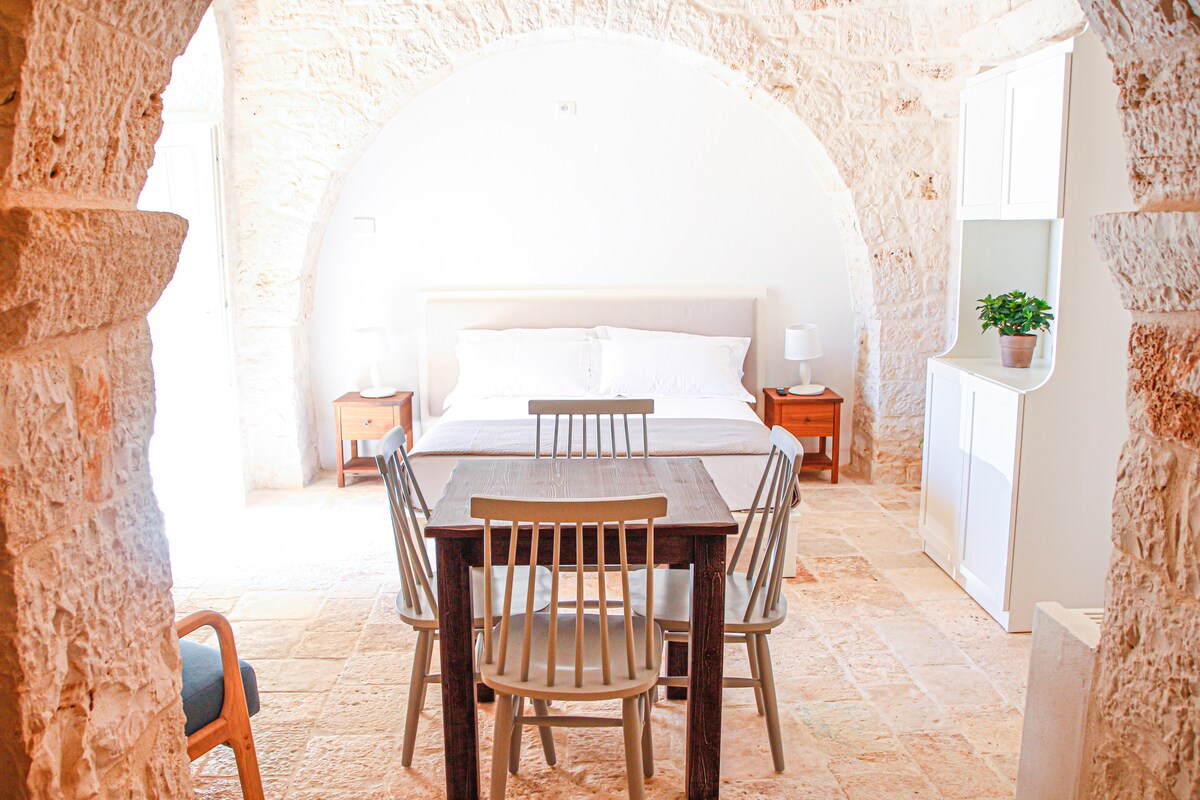 B&B in a 17th-century Masseria, surrounded by 8,500 mq of centuries-old olive groves, just 20 minutes from the beaches of Ostuni. 2 Junior Suites and 2 Suites with direct and independent access from the courtyard. Dazzling white walls, secluded courtyards, arches, stone details, and charming dry-stone walls. Breakfast with organic, locally sourced products: ancient grain bread baked, fruit from our historic orchard, and homemade cakes prepared daily by Patrizia.