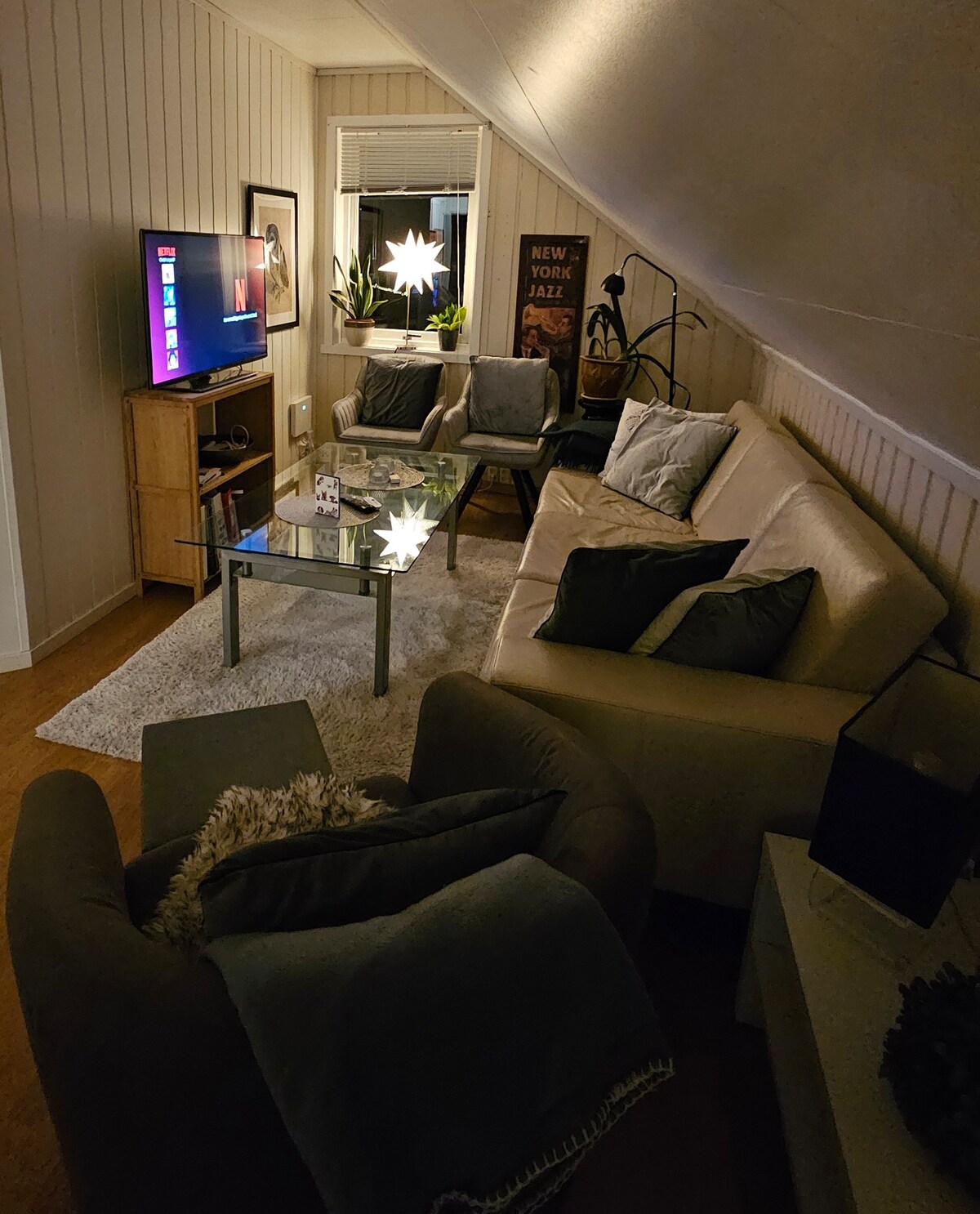 Apartment sa downtown na nasa tabi ng tubig. 14 na minutong lakad papunta sa mga restawran at shopping center sa sentro ng lungsod. Ang apartment ay mainit at komportable, na may mga tanawin ng karagatan, mountain lift at Tromsø bridge. Madaling sumakay ng bus at may mga grocery store sa malapit. Kumpleto ang kusina ng kailangan mo para makapaghanda at makapag‑enjoy ng pagkain sa bahay. May mga handa nang higaan at tuwalya. May dalawang aparador. Dito, puwede kang magrelaks at masiyahan sa tanawin ng kalikasan kapag hindi ka naman naglalakbay sa kapana‑panabik na Arctic Tromsø.
