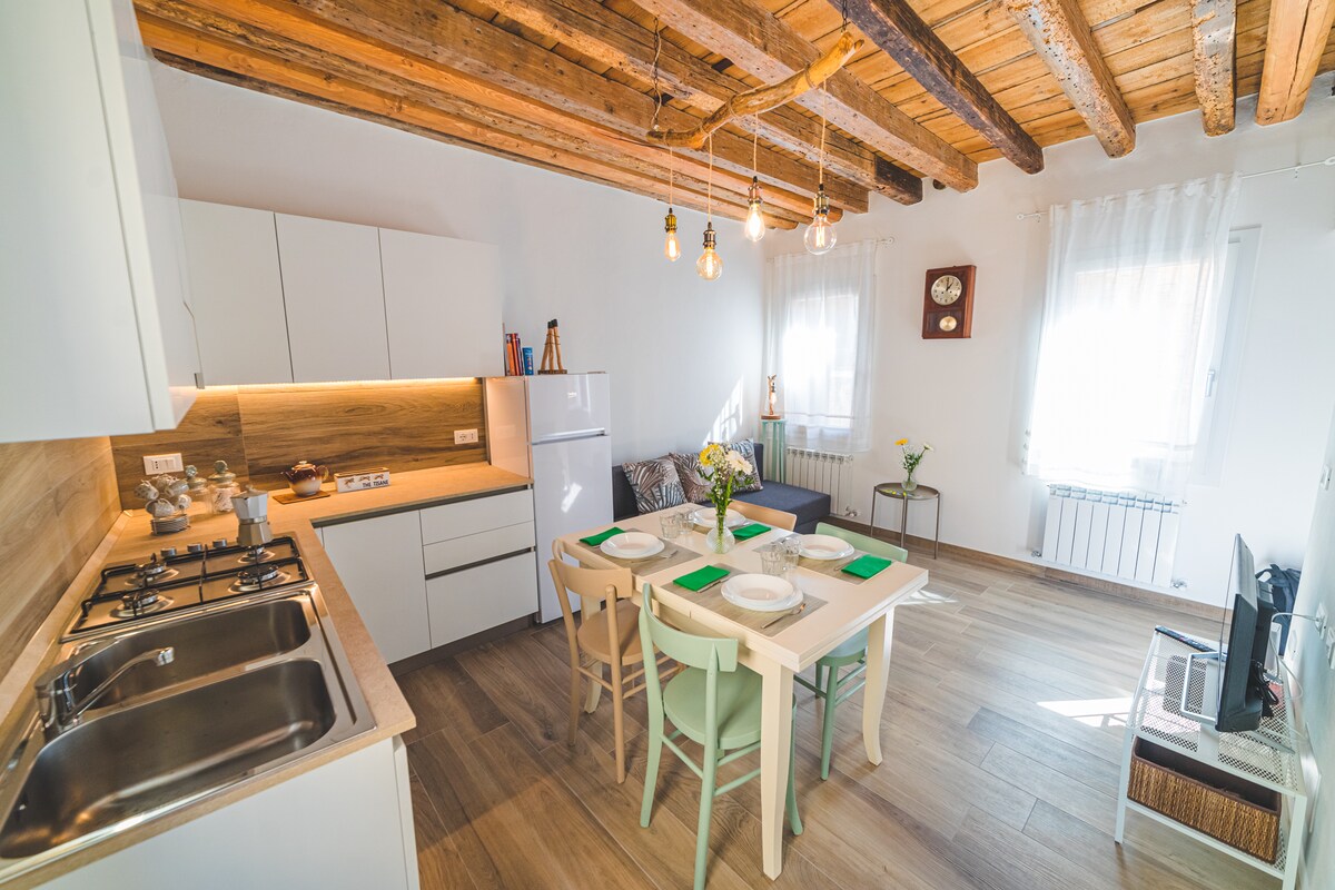Studio apartment in the historic center equipped with every comfort, from laundry to bicycles. The apartment is located on the first floor of a traditional Venetian house from the early 1900s, completely renovated in 2023. Location close to the Duomo, if you arrive by car you will find the Park Saloni at 400 meters (€4 per day) and the Giove car park at 450 meters (€0.50 per hour). Just 1.5km from the beach, also convenient for going with a public or private boat to Pellestrina.
