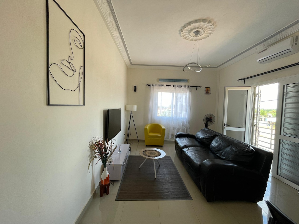 Welcome to this modern and spacious studio apartment in Cotonou— your perfect home away from home in a quiet, safe neighborhood. Enjoy a fully equipped kitchen, a cozy living area with comfy sofas and a smart TV, a dining table, and a private bedroom and bathroom. The space is bright, clean, and thoughtfully designed for relaxation or work. This beautiful appartment is pnly a short drive from the airport, it's close to upscale restaurants in Haie vive and also near supermarkets and shops