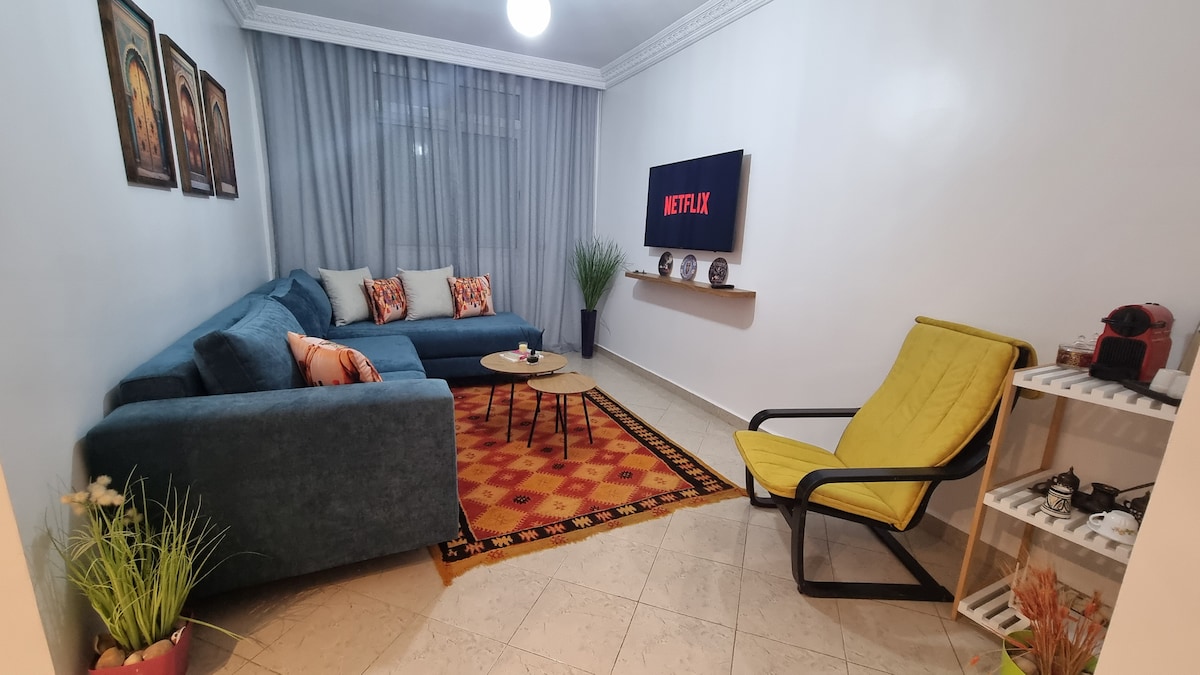 Ipinagmamalaki ng kompanya ng Ilova na ialok ang maliwanag at kumpletong apartment na ito sa unang palapag ng tahimik atligtas na kapitbahayan na Mohammedia central. 5 minutong biyahe papunta sa mga tahimik na beach at ilang hakbang ang layo mula sa mga supermarket, cafe, restawran, istasyon ng tren, na may madaling access sa mga pangunahing highway. Masiyahan sa modernong sala na may tradisyonal na Moroccan touch, kumpletong kusina, balkonahe, 100 Mbps fiber - optic na Wi - Fi, at adedicated workspace, na perpekto para sa mga nagtatrabaho nang malayuan. Available ang libre at ligtas na paradahan. Mag - book Ngayon