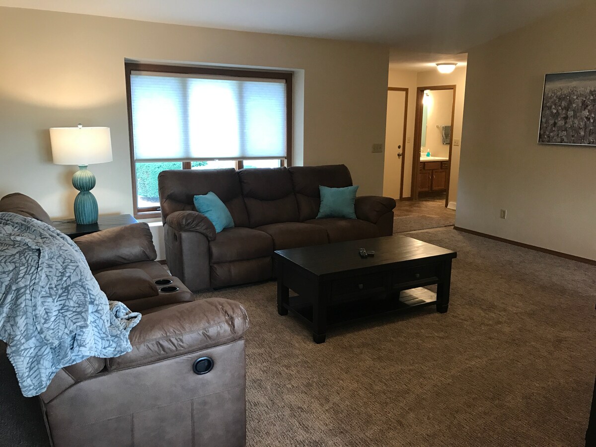 Madaliang mapupuntahan ng buong grupo ang lahat mula sa townhouse na may 2 silid - tulugan na ito na matatagpuan sa gitna. Super komportableng nakahiga na couch at loveseat, king bed sa master bedroom, full - sized washer/dryer sa 2nd bathroom, queen bed sa pangalawang silid - tulugan. Malapit na ang highway para dumiretso ka sa Green Bay o sa kabilang bahagi ng Appleton! Wala pang 25 minuto papunta sa Lambeau Field at 30 minuto papunta sa EAA.