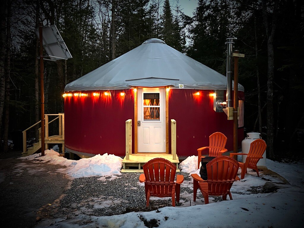 *Please Message us to ask about possible discounts* Welcome to this unforgettable escape in Maine's countryside. Nestled on an old overgrown apple orchard A unique experience that blends comfort and nature, this spacious pine yurt offers a fully applianced kitchen, a cozy interior, 2 bedrooms, & WiFi, imagine sipping coffee on the deck, starlit evenings by the fire pit, and lots of fresh air. With local farms and hiking trails nearby, this luxury yurt is the ideal base for outdoor adventures.