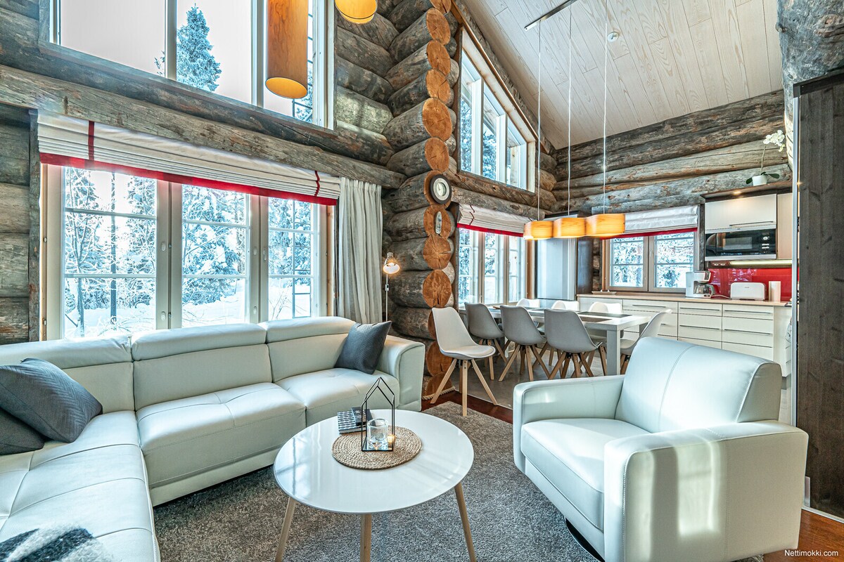 Masiyahan sa isang naka - istilong at tunay na karanasan sa semi - detached log cabin na ito na matatagpuan sa gitna. Ang cabin ay bagong na - renovate at ang mga panloob na muwebles ay pinili nang maingat. Isang silid - tulugan na may double bed at malaking loft na may tatlong higaan. Mataas ang kalidad ng lahat ng higaan at mainam para sa allergy. 5 minutong lakad papunta sa sentro ng Levi, mga restawran, spa, mga slope, mga cross - country track, supermarket at Alko (Liquer store).