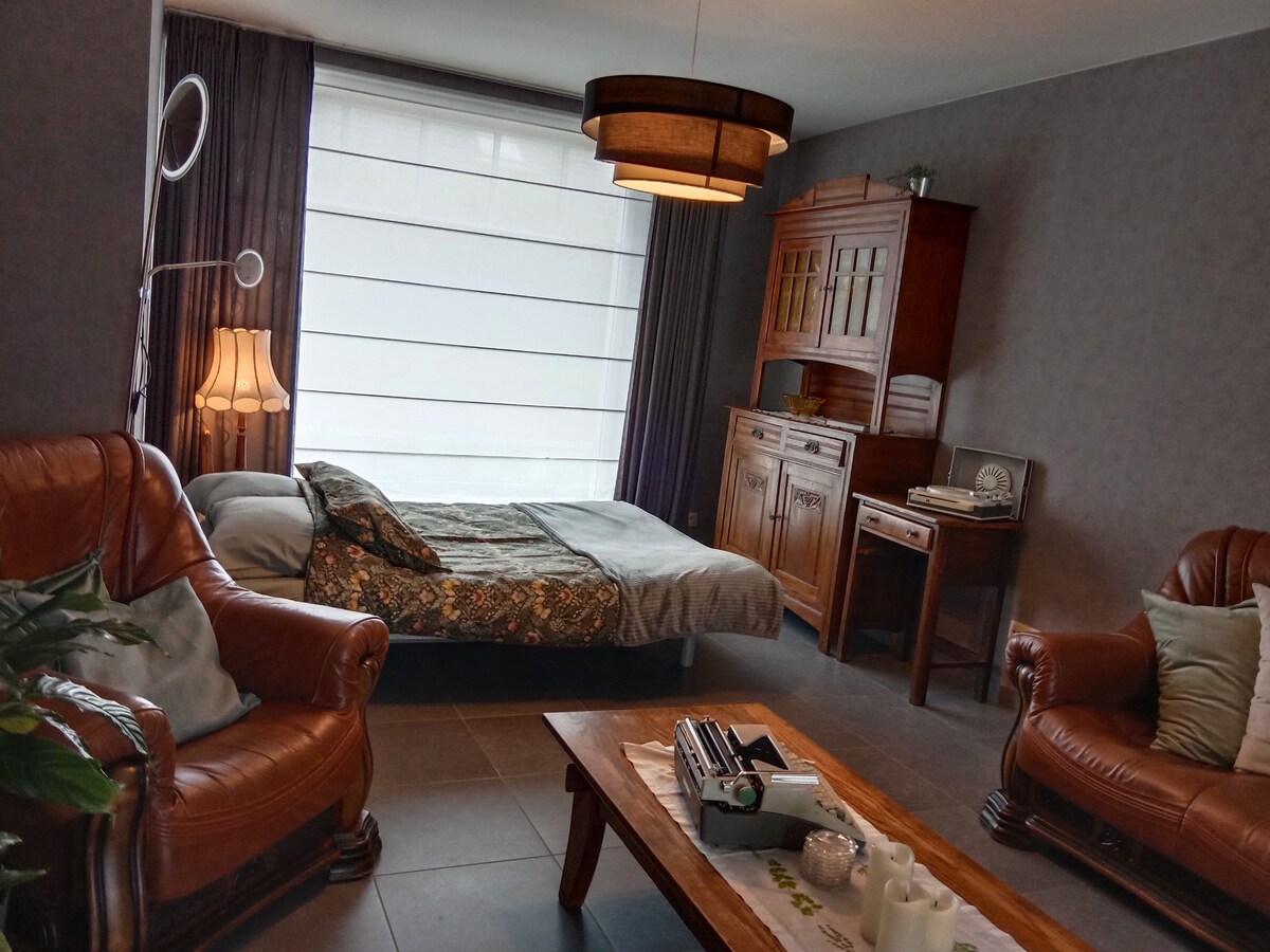 Welkom! Je komt binnen via een eigen ingang. Verderop in deze gang bevindt zich de badkamer die uitsluitend bestemd is voor de gasten van vakantiestudio. Het einde van deze gang wordt in beperkte mate ook door de eigenaar gebruikt. De trap naar boven brengt u naar de studio, met kleine keuken. Er is parkeerplaats voor auto's, overdekte staanplaats voor moto's/fietsen. Er is een grote tuin en een overdekt terras met loungeset waar je tot rust kan komen.