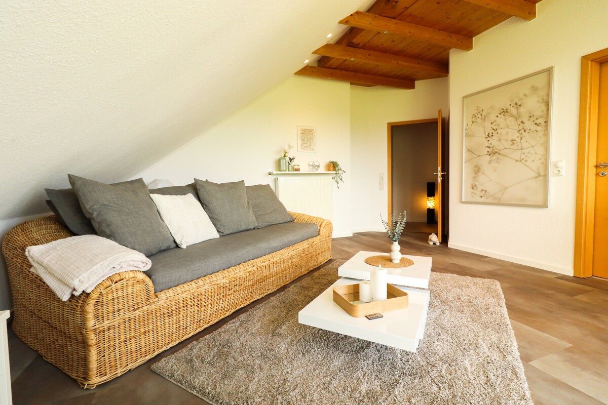 Komfortabel ausgebaute Dachgeschoßwohnung (in einem Niedrig-Energie-Haus) mitten im Grünen. Angenehm kühl im Sommer und kuschelig warm im Winter. Sie ist liebevoll eingerichtet... und... komplett ausgestattet. Vom Balkon aus habt Ihr einen tollen Ausblick auf einen kleinen Bach, Felder, Wiesen...und... 😊 .....unseren wunderschönen Teutoburger Wald.