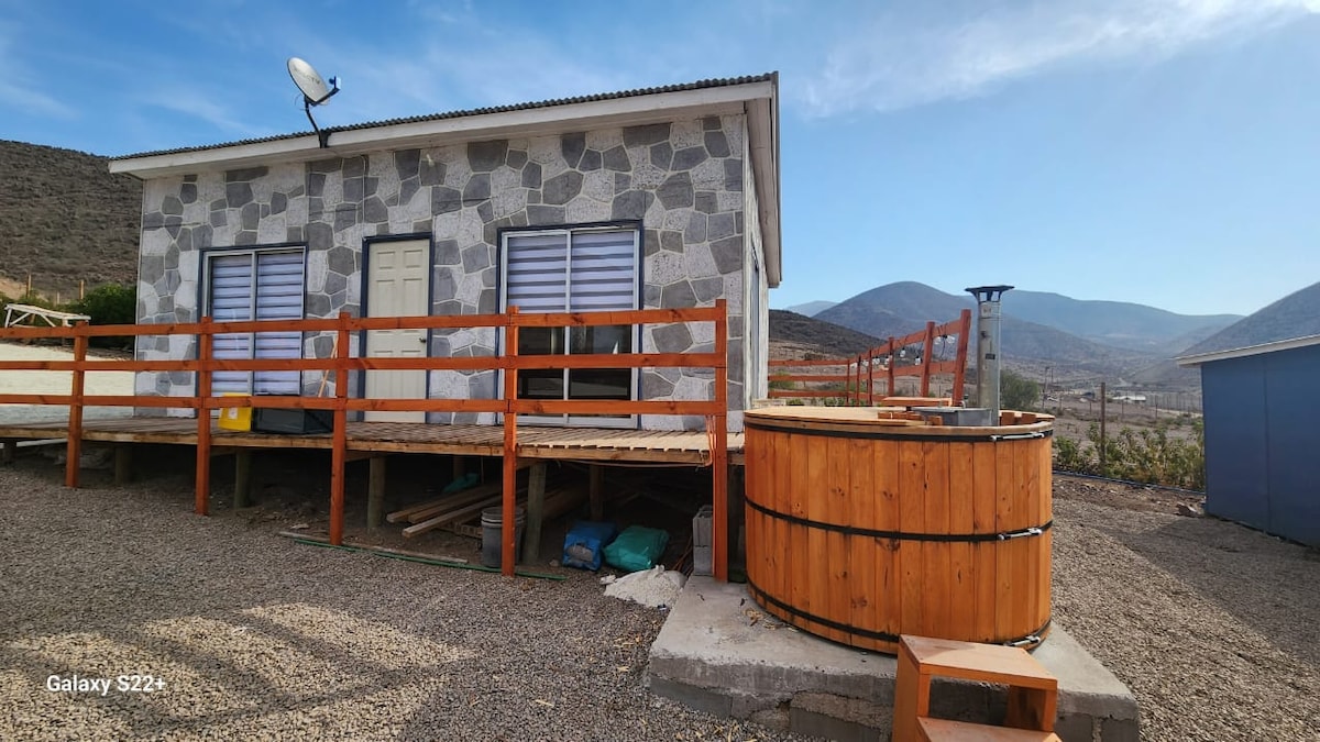 Rustic house, may pool para sa eksklusibong paggamit at matatagpuan sa kanayunan na 1.5 km mula sa Vicuña (5 hanggang 7 mn sakay ng kotse) . Mayroon itong 2 kuwarto, na ang isa ay may nakahilig na bintana para tingnan ang kalangitan sa gabi. Mayroon din itong kahoy na hot tub, lalo na para sa pag-iisip ng mga bituin sa gabi ng Elqui Valley habang naliligo sa mainit na tubig (may karagdagang halaga na $40,000 ang paggamit ng hot tub at dapat i-book ito isang araw bago ang pagdating). May signal ng cellular.