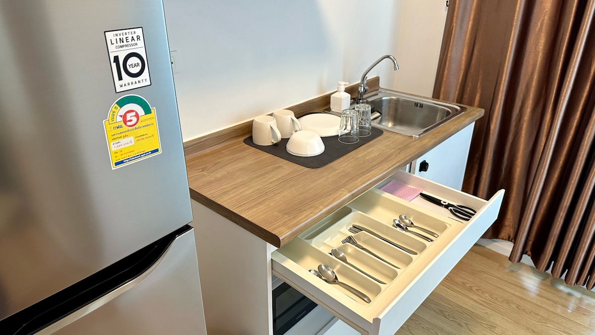Puwede kang pumili at mamalagi sa aking apartment at sana ay magkaroon ka ng magandang biyahe sa Thailand. Matatagpuan ang bahay sa Rama9, LOFT apartment na inihatid noong 2024.Ang laki ng kuwarto ay humigit - kumulang 40 metro kuwadrado, kabilang ang isang silid - tulugan, sala at silid - kainan, kusina, at banyo, na madaling mapaunlakan ng 3 may sapat na gulang. (tps: 1 kama sa silid - tulugan kapag ang reserbasyon ay 1 -2 tao, kung kailangan mong magdagdag ng sofa bed, mangyaring punan ang bilang ng mga tao bilang 3 sa oras ng pagbu - book, at ipaalam sa amin lalo na pagkatapos mag - book na ayusin namin para sa mga kawani na gawin ang sofa bed bago ka mag - check in) Kasama sa presyo ng reserbasyon ang paggamit ng buong property, pati na rin ang gastos sa fitness center, swimming pool, at co - working space.