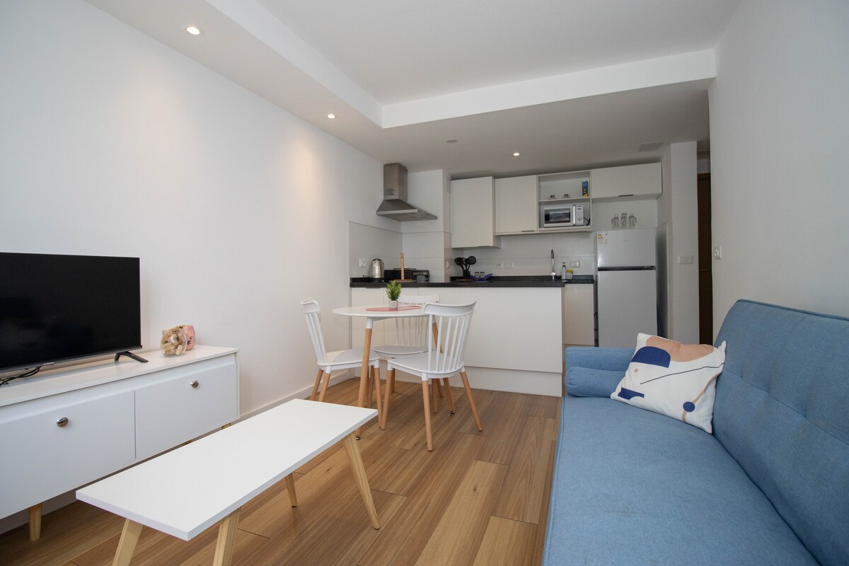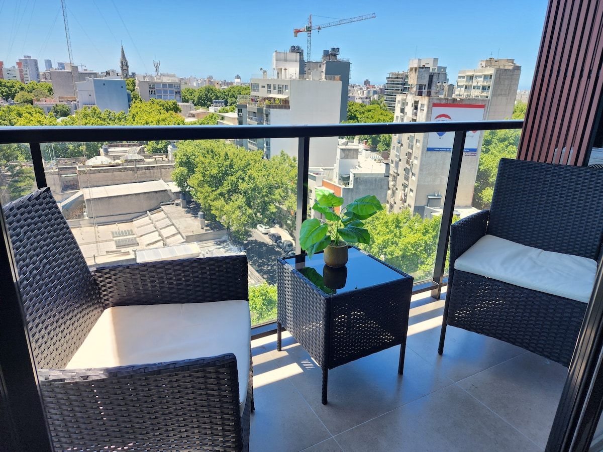 Modernong 1-bedroom apartment sa Parque Rodó. Maliwanag at tahimik, na may malalaking bintanang may double glass. Kusinang kumpleto sa kagamitan na may refrigerator, oven, microwave, mga kubyertos, at pinggan. Bukas na living-dining area na may 43" Smart TV at home office na may Wi‑Fi. Kuwartong may queen bed at access sa balkonahe, at full bathroom. Napakagandang lokasyon: ilang hakbang lang ang layo sa Parque Rodó at Rambla, at napapaligiran ng mga café, tindahan, at pampublikong transportasyon.