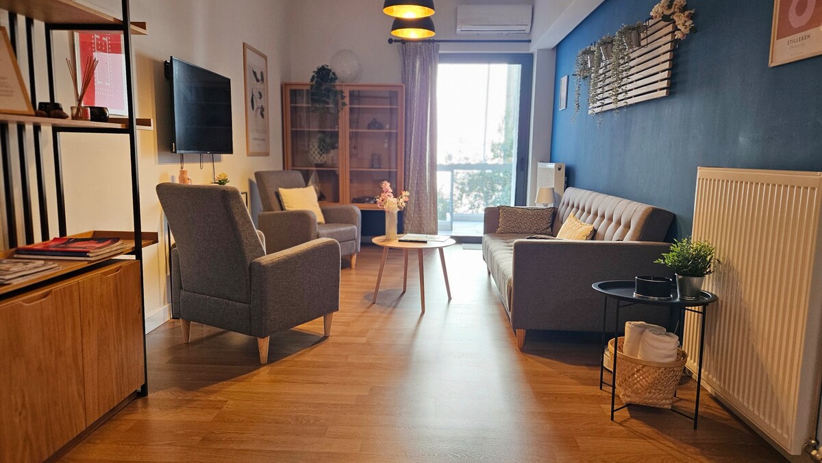 ПерApartment 47 sq.m. na may isang silid - tulugan, sala, hall at hiwalay na kusina. Madali itong makakapagpatuloy ng 3 bisita - may double bed at sofa. Available para sa iyo ang lahat ng amenidad - Wifi, washing machine, smart TV. Magandang lokasyon - 15 minutong lakad mula sa beach. Makakakita ka sa malapit ng maraming restawran at cafe para sa bawat panlasa. Napakadaling puntahan ang sentro ng Athens gamit ang pampublikong transportasyon (15 minuto sa pamamagitan ng bus o tram).