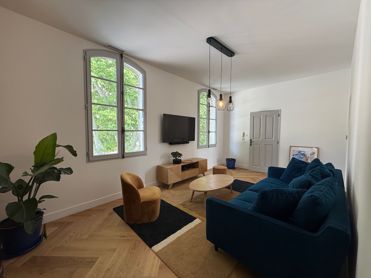 Nasa gitna mismo ng Avignon at nakaharap sa Palasyo ng mga Papa. Malaking apartment na ganap na naka - air condition at na - renovate noong 2025, mayroon itong lahat ng kailangan mo para komportableng mapaunlakan ang 4 na tao na may 2 silid - tulugan at 2 banyo. Pinalamutian at nilagyan ng interior designer, hihikayatin ka ng apartment na ito sa dami at mga amenidad nito. Sa ibabang palapag ng gusali, mayroon kang paradahan ng Palasyo ng mga Papa.