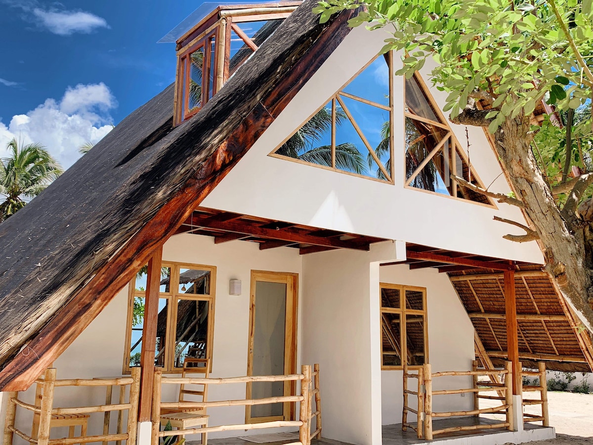 Isang Modern Cozy Beach Cabana na binubuo ng kahoy na matatagpuan nang direkta sa harap ng beach na 20 metro lamang ang layo na nakaharap sa baybayin. Nagtatampok ang Cabana na ito ng fully Air - conditioned room na may ensuite private bathroom, Water heater shower, Balcony, Wifi, at Seaview. Perpekto ang lugar na ito para sa pagpapahinga, Chilling, at pagtangkilik sa mga nakamamanghang sunset. Maraming aktibidad ang iaalok sa mga bisita ng matagal na pamamalagi. Palaging available sa site ang mga napaka - kapaki - pakinabang at magiliw na staff.
