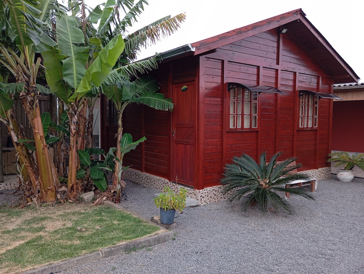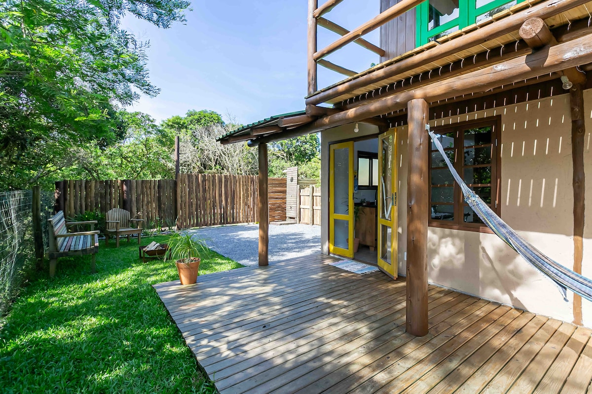 Cabana na kumpleto sa kusina, minibar, banyo na may gas hot shower, internet, mga bentilador, barbecue, window mosquito screen, double at single bed, pribadong paradahan. Maganda at komportable ang cabin, sa napapanatiling bahagi ng paraiso ng Guarda do Embau sa gitna ng mga napapanatiling katutubong halaman, 800 metro mula sa beach, 15 minutong lakad. Mayroon itong mahusay na imprastraktura sa kapitbahayan, na may pamilihan, butcher's, gas station, pet shop at mga restawran na malapit sa bahay.