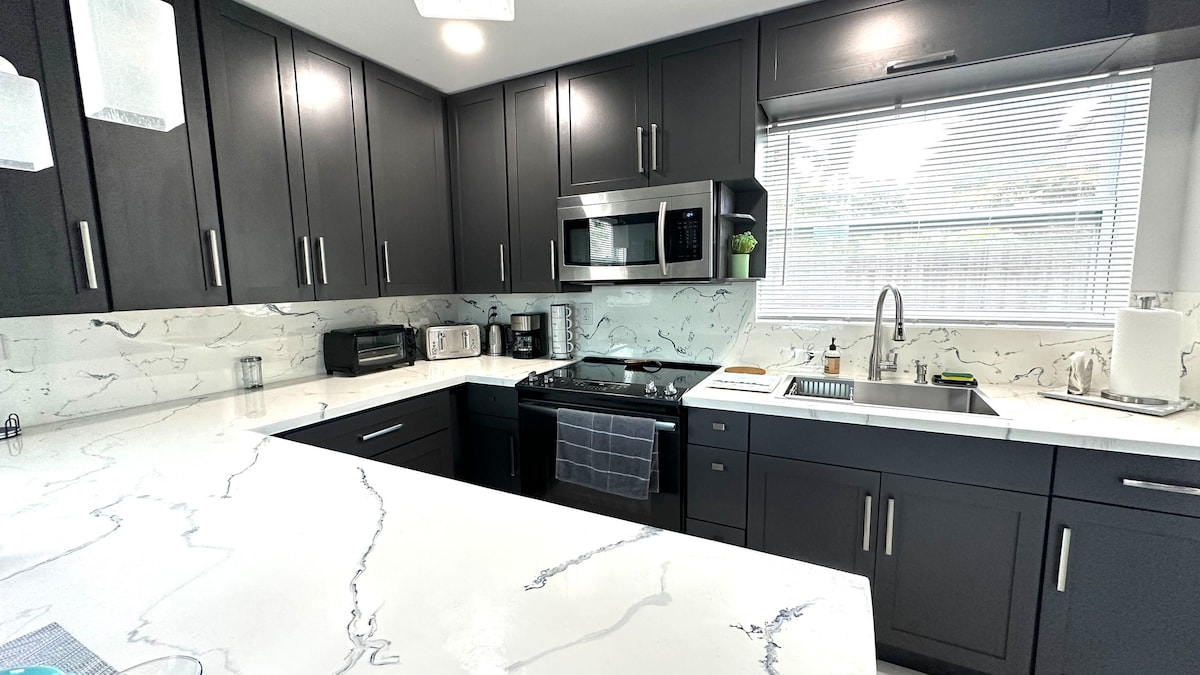 Maligayang pagdating sa aming bagong ayos na executive standalone na bahay, na nagtatampok ng mga modernong kasangkapan, high - end na kasangkapan, at mararangyang amenidad. Magrelaks sa maluwag na sala, magluto ng gourmet na pagkain sa kusinang kumpleto sa kagamitan, o magpahinga sa malaking patyo na may komportableng muwebles sa labas. Magugustuhan mo ang jet massage shower, malambot na king size bed, at tahimik na lokasyon. Tangkilikin ang pribadong pasukan, dalawang nakalaang paradahan, at smart 65" TV. Mag - book ngayon para sa isang maginhawa at marangyang pamamalagi sa West Palm Beach.