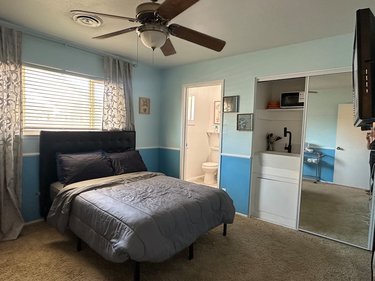 Bagong 2023 pribadong guest suite na matatagpuan sa Lungsod ng Lancaster. Kasama sa suite ang kumpletong kumpletong sala na may maliit na kusina, king size na higaan, lugar ng trabaho sa opisina, pribadong patyo, at pribadong pasukan na may sariling A/C! Maikling biyahe papunta sa mga kompanya ng Aeronautic sa Valley. 5 minuto lang ang layo mula sa mga grocery store at restawran, pero nakahiwalay sa kaguluhan ng lungsod. Kung bumibiyahe ka para sa negosyo o kasiyahan, papahintulutan ng pribadong suite na ito ang kaginhawaan at privacy na kailangan mo!