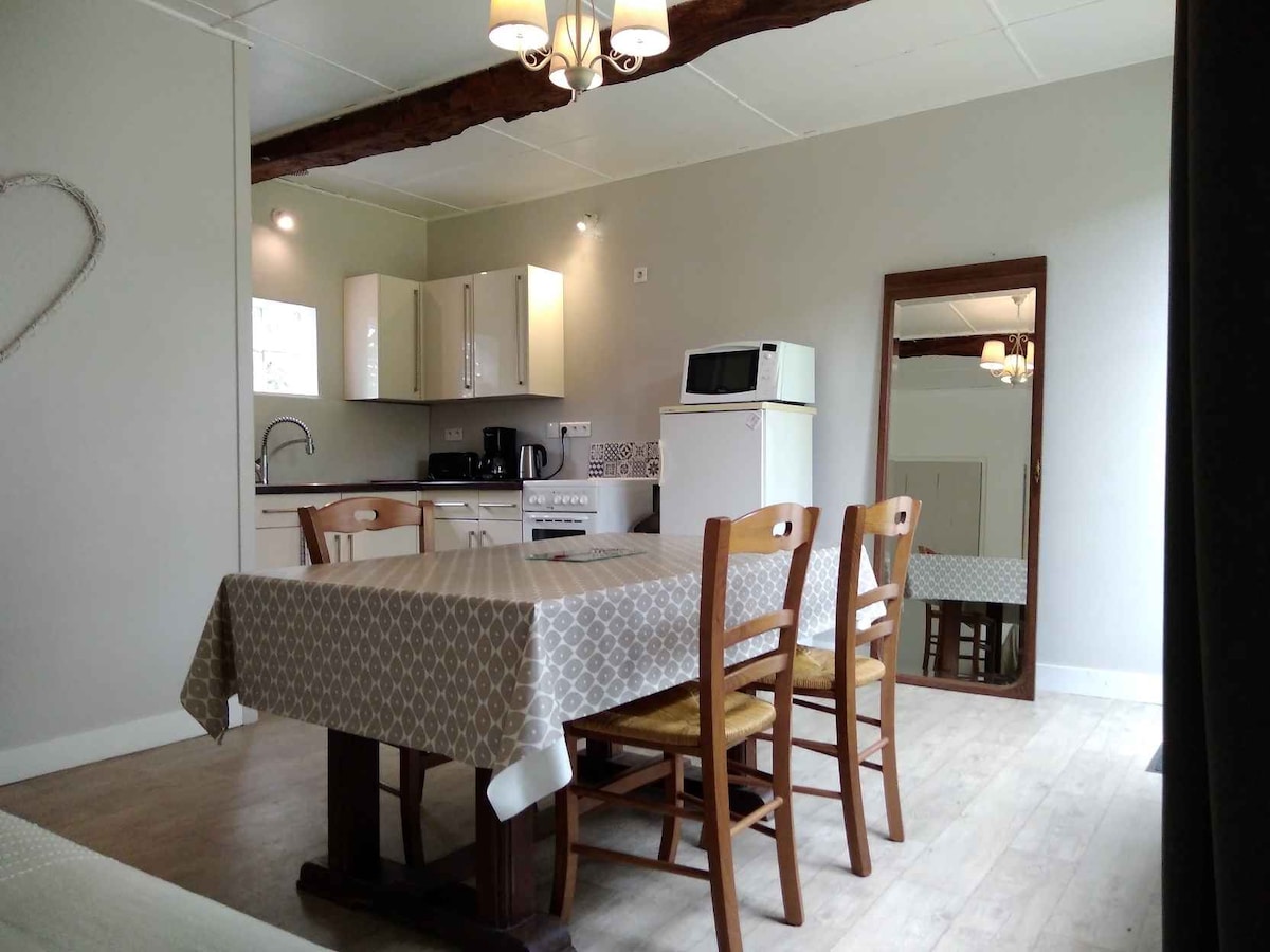 Charmant four à pain ancien en colombages, situé en bord de ruisseau il se compose de : - Salon avec un poêle à bois, - Cuisine, - A l’étage : -salle de douche/WC accessible par une échelle de meunier (voir photos), -chambre avec un lit 160x200 avec vue sur le ruisseau, accessible par une échelle de meunier (voir photos), Chambre et salle de bain ne communiquent pas. Salon de jardin, BBQ, parking privé, bois de chauffage inclus Note autre gite, la Maison de pierres, est à 100m