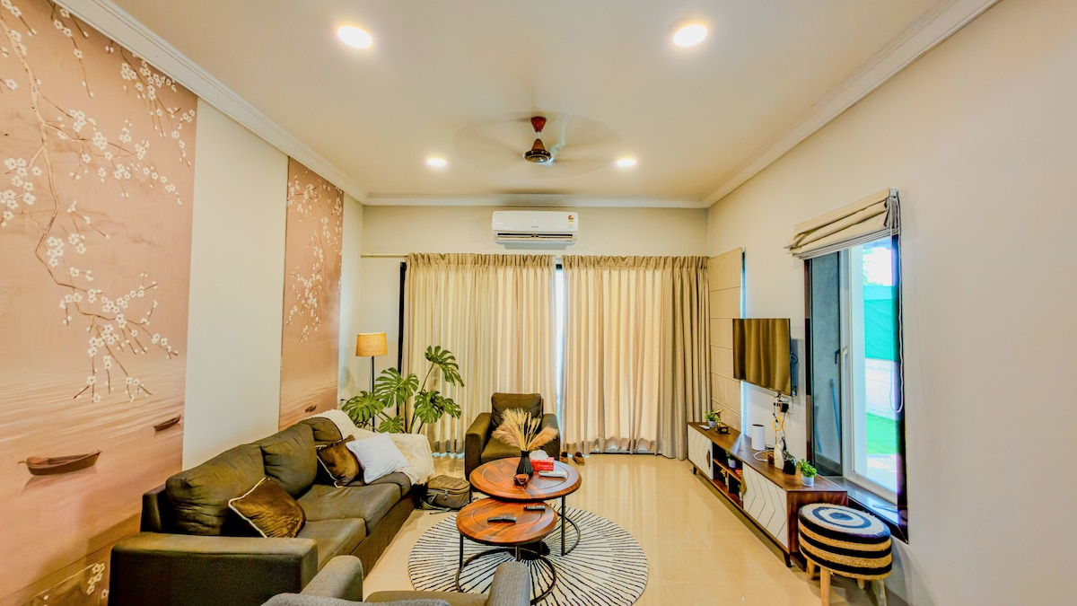 "Namaste! Welcome to your home away from home. This brand new modern home is away from city hustle-bustle and offers stunning views of orchards around. The beach is a short 2.2 walk. This part of the beach in Calangute is paradise, quiet & peaceful with nice shacks, allowing you to enjoy the sun at peace with the sea. Coracao specialties include Airconditioned living & bedrooms, Daily housekeeping, 100mbps wifi, modular kitchen, fridge, washing machine, pool & gym, kitchenware, and smart tv.
