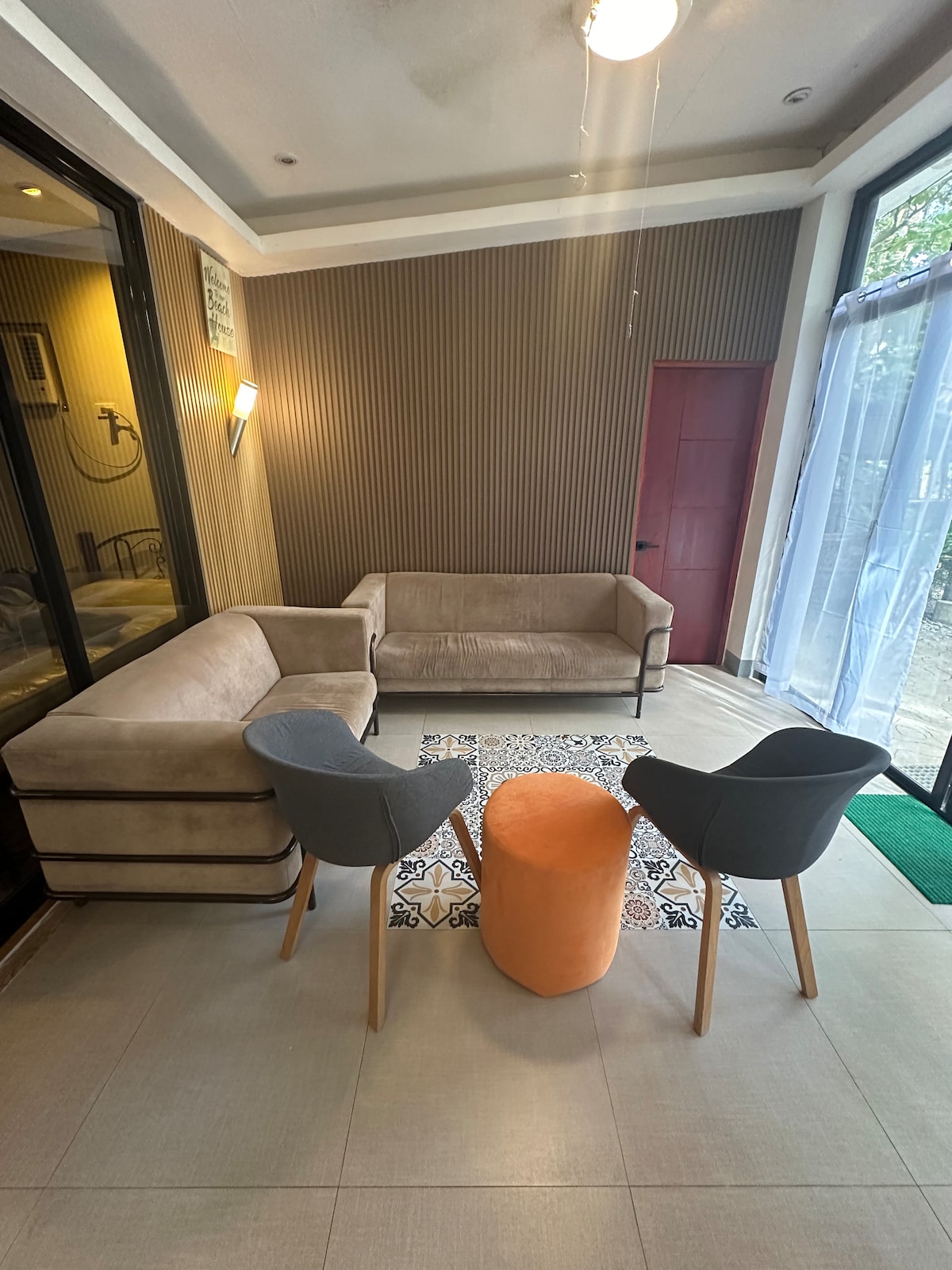 This is a spacious setup combining our studio and 1-Bedroom unit via a connecting door. It is located in a quiet, peaceful neighborhood just 5 minutes from the town proper and the nearest beach. The unit includes a living room, mini kitchen with dining area, two (2) bedrooms, and two (2) bathrooms— spacious enough for families or group of friends.