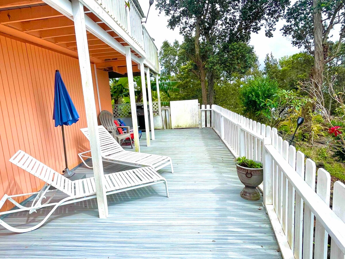 Tangkilikin ang mga astig na tanawin ng paglubog ng araw sa ibabaw ng karagatan habang napapalibutan ng mga luntiang dahon ng gubat. Ang amoy ng plumeria at ang banayad na mga tawag ng mga tropikal na ibon ay hindi kailanman hahayaan mong kalimutan na ikaw ay nasa paraiso. Habang narito ka, magiging bato ka mula sa maraming magagandang lugar para mag - snorkel, pati na rin sa Lugar ng Refuge National Park. Ito ay isang napakalakas na base camp upang tuklasin ang Volcanoes National Park, Mauna Kea Observatories, ang pinaka - katimugang punto ng US, isang itim na buhangin Beach at marami pang iba!