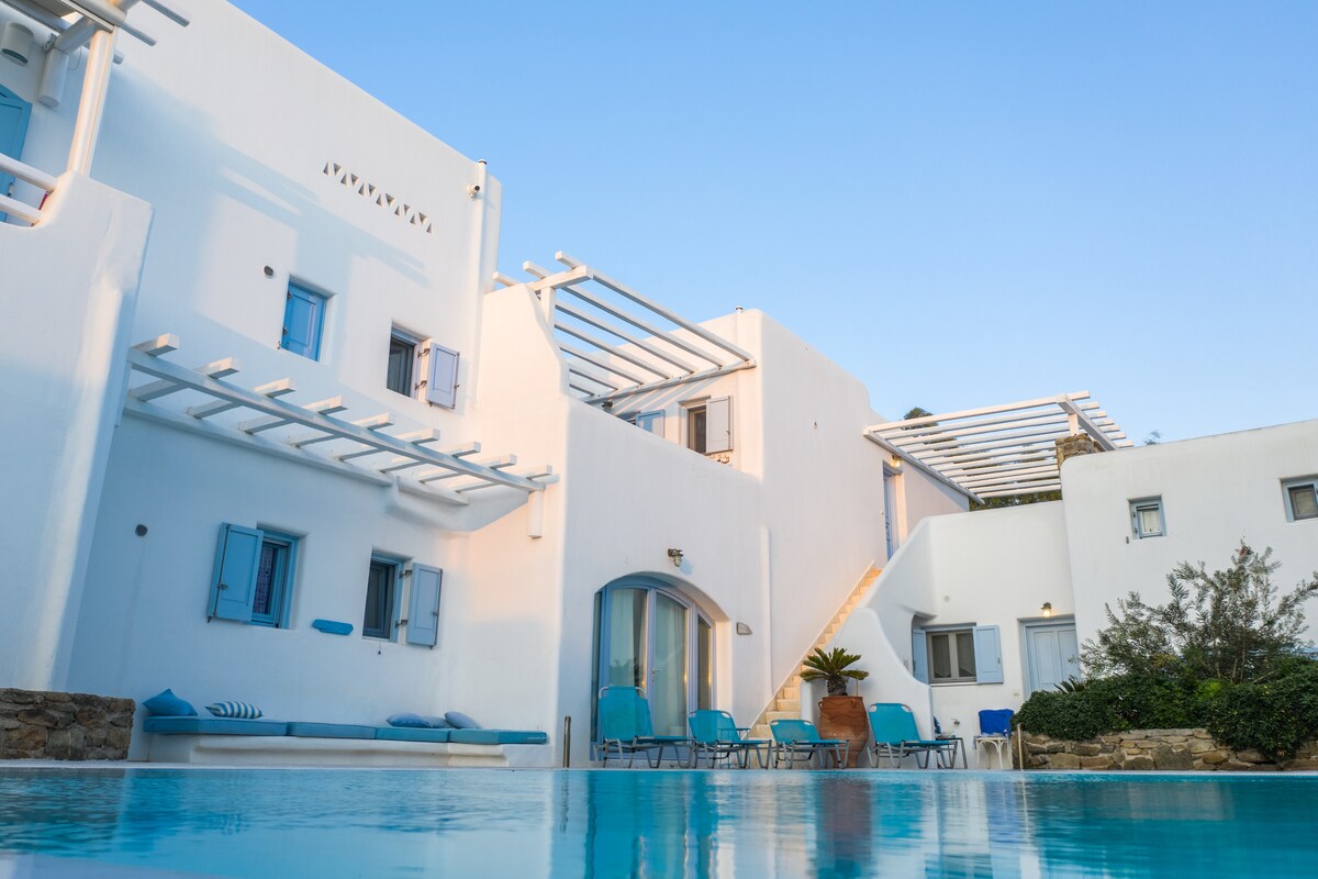Sea view in a beautiful Mykonian Residential COMPLEX. GREAT LOCATION My place is close to the beach, nightlife, public transport, pharmacy, super market, bakeries and the airport. Ideal for couples, solo adventurers, and business travelers. Swimming pool Friendly environment. Accommodates 4 people. Location in a quiet area. 2 klm from Mykonos Center. 7 min walk from beautiful Ornos beach. 4 mins walk from Bus Station. a variety of shops and restaurants. WI-FI. & NETFLIX.