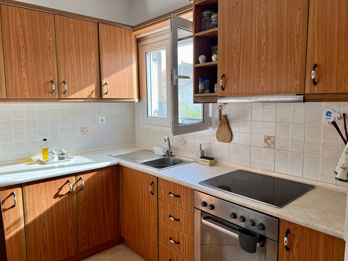 Traditional - style na hiwalay na bahay na may malaking berde at puno ng mga bulaklak na panlabas na espasyo. Isang komportableng komposisyon ng pag - upo para ma - enjoy ang iyong almusal at magrelaks sa gabi. Malaki at komportable ang panloob na espasyo ng bahay. Sa layo na 50 m ay ang beach at sa tabi mismo ng hotel na "Monica" kung saan may swimming pool. Napakalapit na may iba 't ibang tavern, cafeteria, at supermarket. Sa lugar ay ang sikat na "Canal d amour" na may payapang paglubog ng araw