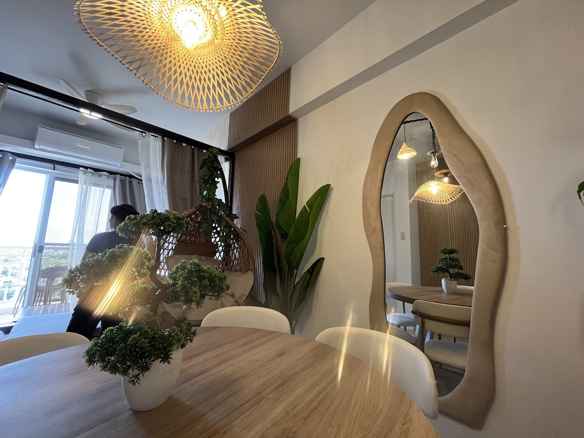 Ang lugar na ito ay isang pagsasama - sama ng Japanese at Scandinavian na disenyo na perpekto para sa grupo ng 6. Mayroon itong 2br, 1 queen - sized bed, 1 convertible sofa bed, at double deck. Ang sala ay may 55 pulgadang TV, mga board game tulad ng chess at Uno, at sungka. Ang kusinang kumpleto sa kagamitan ay nagbibigay ng karanasan na tulad ng tuluyan. Mayroon din itong bar table at bar stool, at balkonahe na may tanawin ng mga ilaw ng lungsod. May access ang unit ng condo sa mga pinaghahatiang pasilidad (palaruan, pool, picnic area, paved jogging area), at sky lounge.