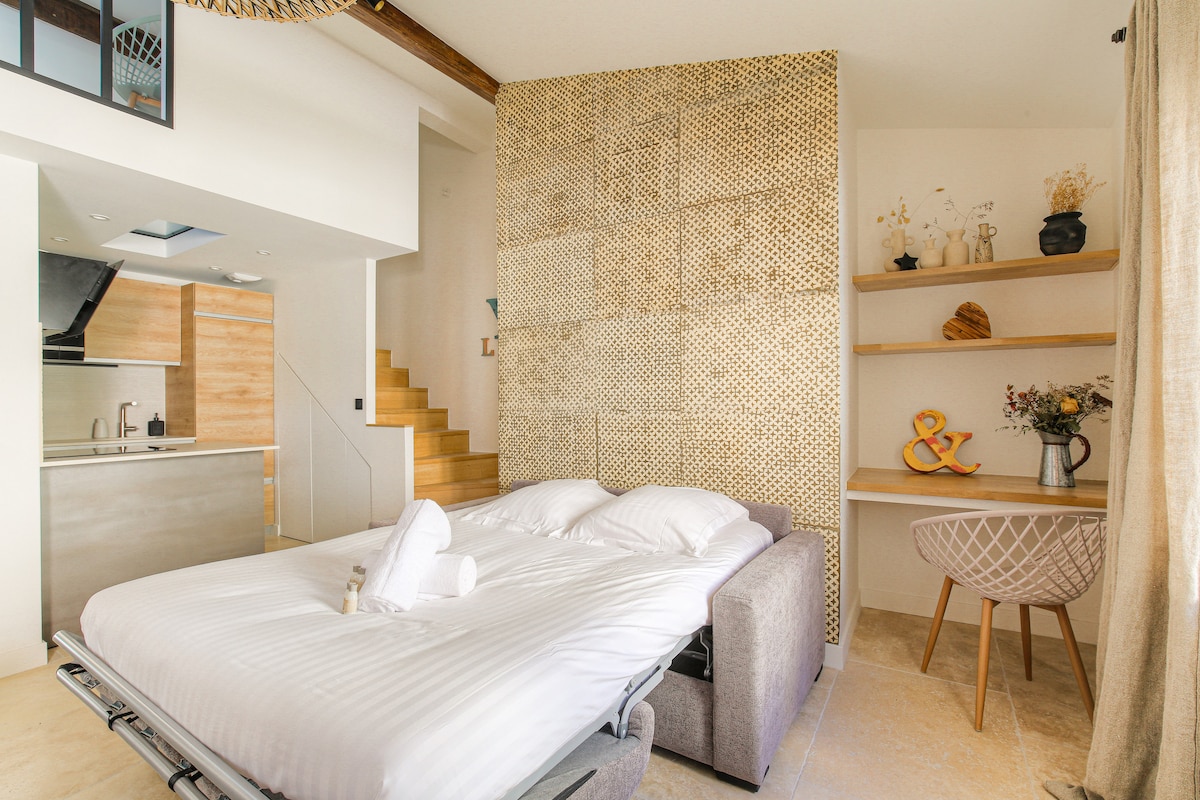 Ikinagagalak naming i - host ka sa aming kaakit - akit na cocoon. Ang apartment na ito ay may lahat ng mga pangunahing kailangan para sa isang komportableng pamamalagi, magiging komportable ka rito! May kapasidad na 4 na tao, kabilang ang duplex na tulugan, 42 metro kuwadrado ito. Kasama ang Nespresso machine, at Wifi pati na rin ang mga sapin at tuwalya. Para sa higit pang impormasyon, huwag mag - atubiling basahin ang detalyadong paglalarawan sa ibaba.:)