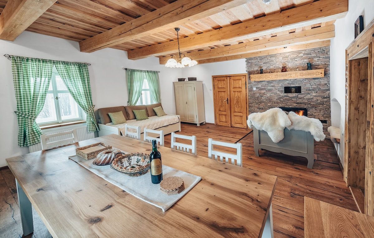 Tuluyan sa isang dating farmhouse para sa 6 na tao, 2 silid - tulugan, kusina, banyo at banyo, espasyo sa imbakan para sa mga bisikleta at kagamitan sa sports, nakapaloob na bakuran, panlabas na fireplace, grill, paradahan sa nakapaloob na bakuran. Malaking kamalig na angkop para sa mga pagdiriwang, kasalan, posibilidad na matulog sa kamalig para sa iba pang bisita. Posibilidad ng camping sa hardin. Kalinisan na walang mga kapitbahay. Huminto ang bus malapit sa cottage.