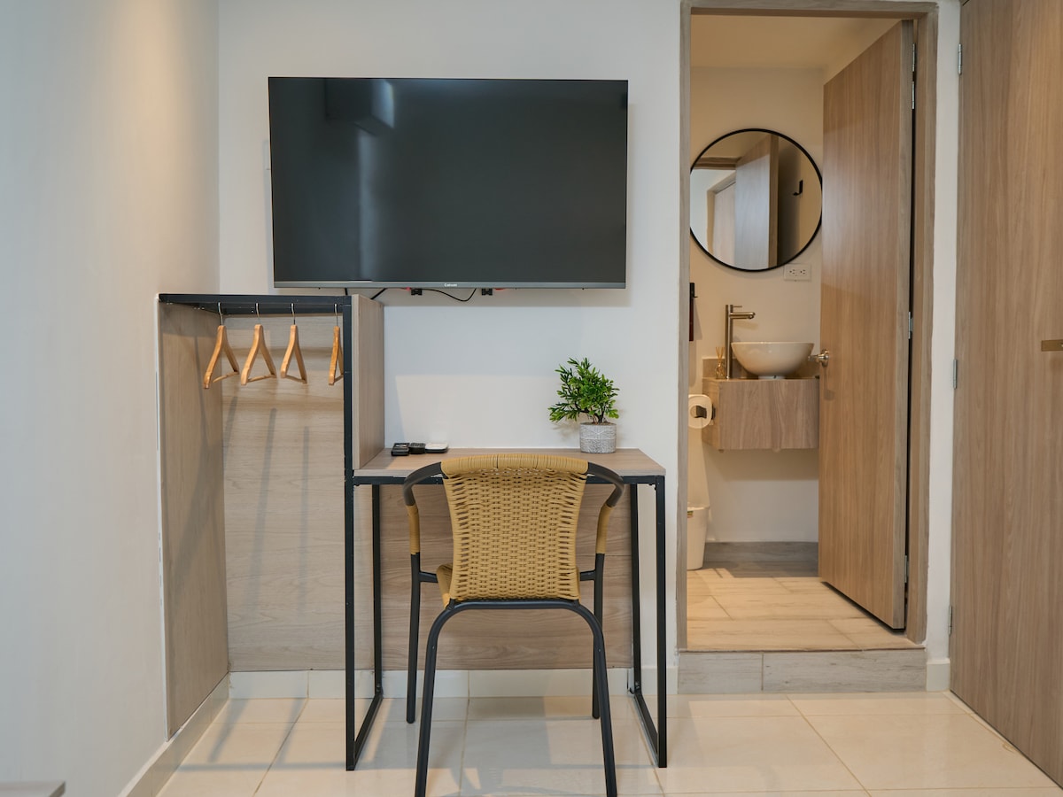 Kasama sa aming kuwarto ang Double Bed, Air Conditioning, HIgh - speed Internet, TV na may Netflix, Toiletries, Open Closet. at Komportableng Desk. Nag - aalok kami ng aming LIBRENG almusal sa Caimán - ang aming cafe sa labas - kung saan makikita mo rin ang mga pastry at plato mula sa aming masarap at masarap na Colombian Cuisine.