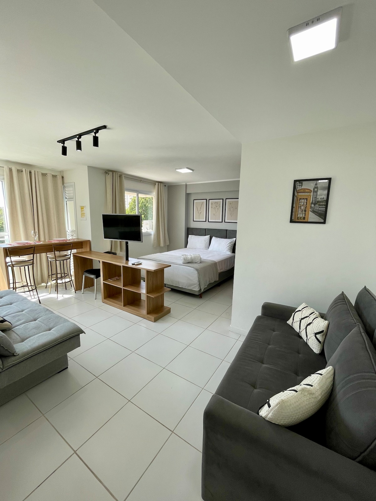 Pribadong suite, patag na modelo, komportableng matatagpuan sa Verano Stay. Karaniwang lugar na may swimming pool, gym, beauty salon, convention room at restaurant na may mga pagkain sa napaka - abot - kayang presyo. Matatagpuan sa loob ng Rio2 Park complex, na may 24 na oras na seguridad, berdeng lugar sa paligid para sa hiking at kalapit na komersyo na may mga supermarket, parmasya, restawran, snack bar at labahan (distansya na 450m). May 24 na oras na reception at elevator ang gusali. Pribado at independiyente ang pasukan sa suite