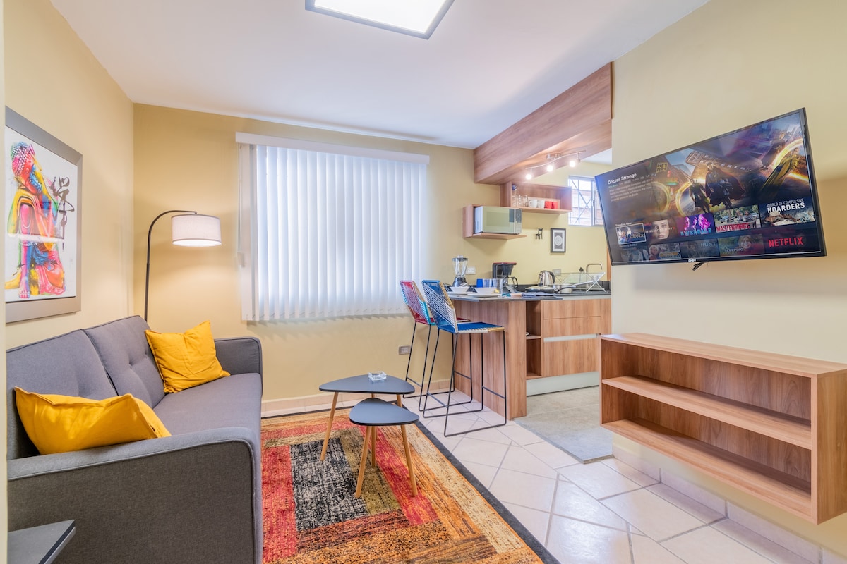 Departamento moderno tipo LOFT. Cuenta con barra de cocina, incluye: frigobar, horno de microondas, parrilla de inducción, sartenes y más accesorios. Cama matrimonial y buro. Con Smart TV, closet, patio de servicio propio con lavadero. Baño completo con agua caliente por medio de boiler solar. Escritorio con silla ejecutiva y sofá cama.