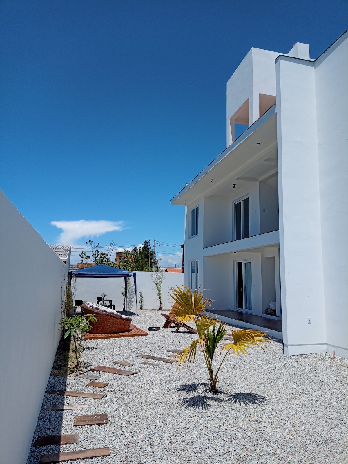 Isang natatangi at kumpletong bahay! May magandang patyo, pool, sala, 3 silid - tulugan (na may dalawang double bed at isang single bed), 1 buong banyo, 1 banyo, kumpletong kusina, Isang kahanga - hangang PIZZA OVEN. Matatagpuan 2 minuto mula sa Passo de Torres - SC Beach at 3 minuto mula sa Moles Beach sa Torres - RS sakay ng kotse.
