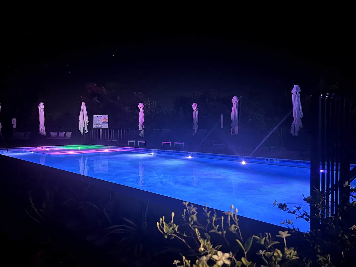 Heavenly Suíte #2 at The M @ The Edge is a studio apartment with sleek & modern furnishings, smart HD TV, sound bar, chandeliers, state of the art kitchenette with quartz counter-tops, Delta faucet, and under counter lights. The chic bedroom fashioned in white crisp tiles, scones and recessed lighting mimics the luxurious bath styled in porcelain & Carrera tiles, Delta faucets, mirrors. . The patio enlivened by red/white accents, greenery, bar, pergolas, and Jacuzzi.