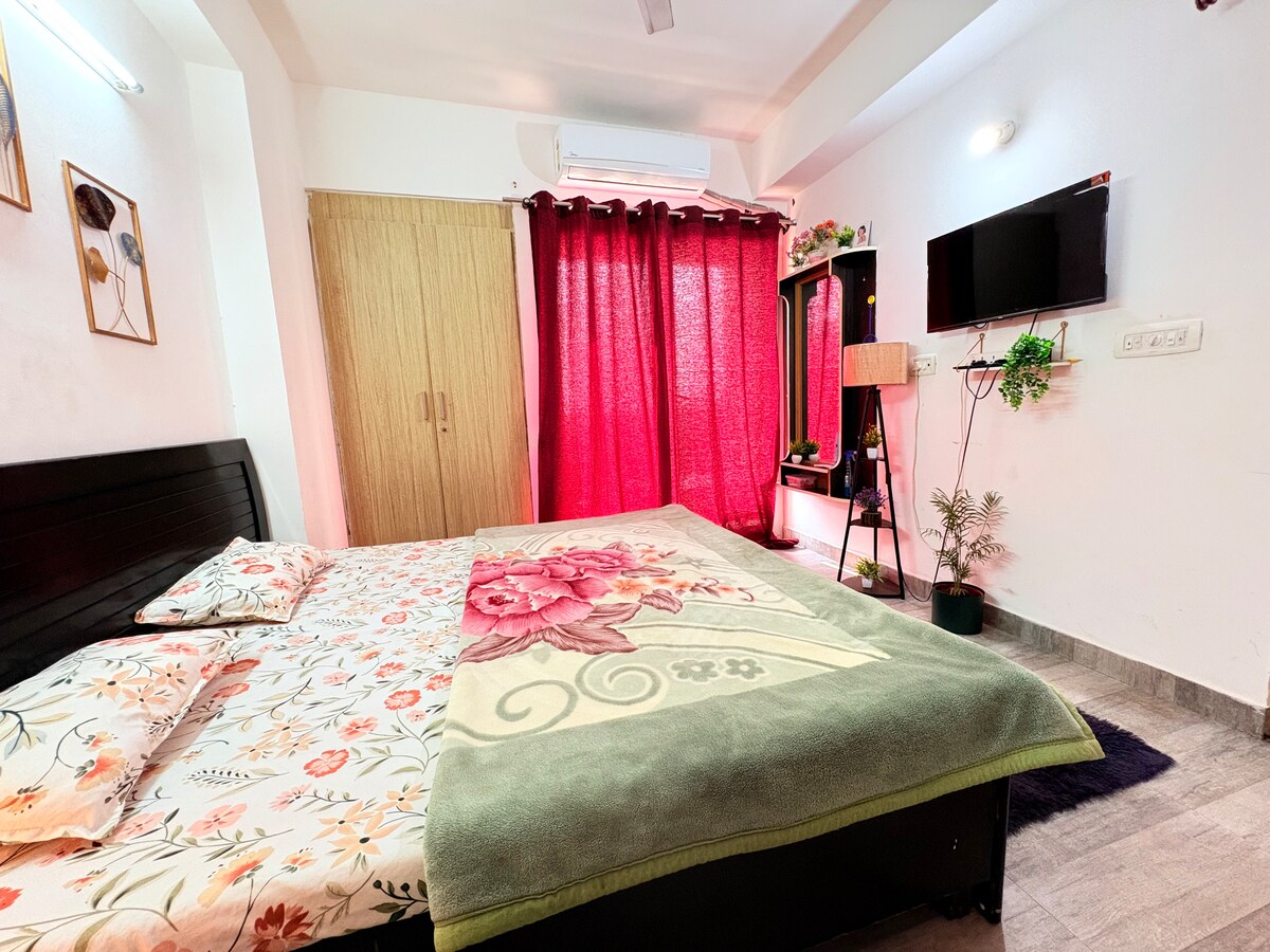 A cozy 2BHK home with a view straight out of a movie—watch sunsets, rainbows, and the Himalayas from your balcony overlooking a 9-hole golf course. Perfect for couples and families, it features a designated workspace with ergonomic chairs, handpicked furniture, and art. The living room is made for Netflix nights with a sound system, high-speed WiFi, and a fully equipped kitchen for home-style comfort. 15 mins to Rajpur road.