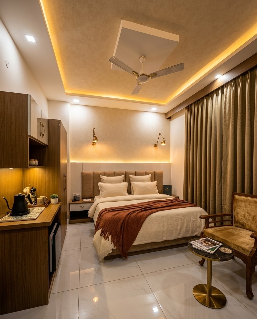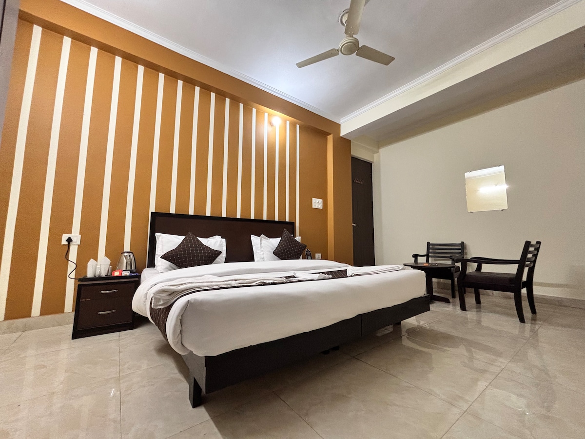 **Deluxe King Room | Malinis at Komportable** Komportableng Deluxe Room na may king‑size na double bed, air‑condition, at nakakabit na pribadong banyo. Angkop para sa mga mag‑asawa o munting pamilya, at may dagdag na floor mattress na available kapag hiniling para sa dagdag na bisita. May mabilis na Wi‑Fi, araw‑araw na paglilinis, power backup, at access sa mga common area. Mainam para sa mga biyaherong naghahanap ng malinis, tahimik, at maginhawang matutuluyan sa Haridwar.