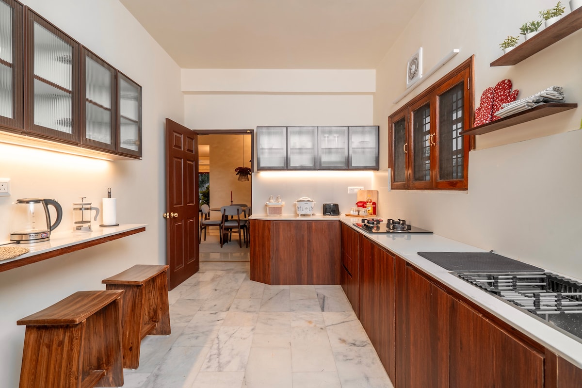 Welcome to THE VINTAGE GROVE Step into a premium vintage-themed 3BHK where old-world charm meets modern luxury. More than just a stay, It is your refined city escape. Located in a prestigious neighborhoods, this thoughtfully curated home is perfect for families, friends, and business travelers seeking space, style, and comfort. With rich vintage aesthetics, cozy corners, lush indoor greenery, and a warm-white glow that feels like golden hour -- every detail is crafted to elevate your stay.