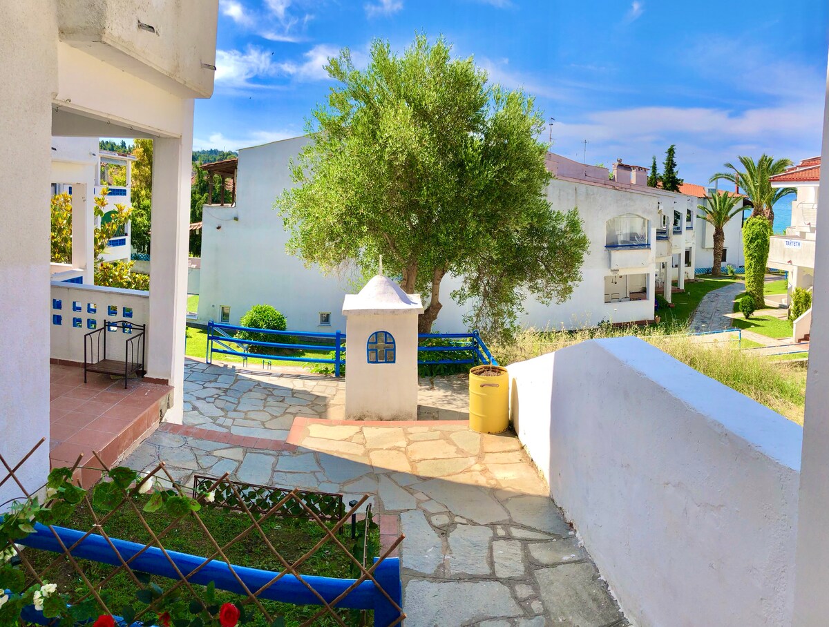 Kung naghahanap ka ng abot - kaya, natatangi at magandang bakasyon, nahanap mo na ang iyong destinasyon. Isang family residential complex, 3'lang mula sa dagat at sa tabi din ng ilan sa mga pinakasikat na beach - bar ng Halkidiki. Matatagpuan ang "Geobasement - Village" sa isang tahimik na lugar na may malaking bakuran at BBQ. Sa BASEMENT ay may 2 silid - tulugan, sala, at kusina. Habang ang banyo ay matatagpuan sa labas ng apartment sa common area ng bakuran.