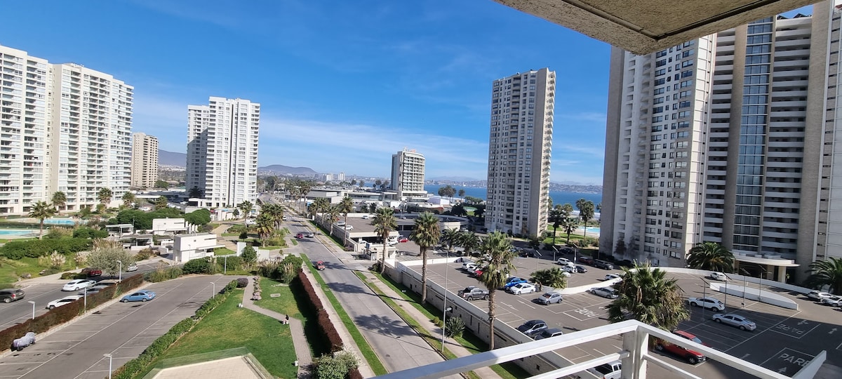 Hermoso departamento, con espectacular vista y ubicado en condominio Gran Marina a pasos de la playa y casino Enjoy. - Habilitado para 5 personas. - Completamente amoblado. - 2 dormitorios. - 2 baños. - Terraza - Tv por cable en dormitorio principal y living. - Internet. - Estacionamiento. - Condominio cuenta con acceso controlado. - Quinchos. - Piscina. - Amplias áreas verdes. - Lavandería. - A pasos de la playa. - Junto al casino Enjoy Nota: Toallas no incluidas.