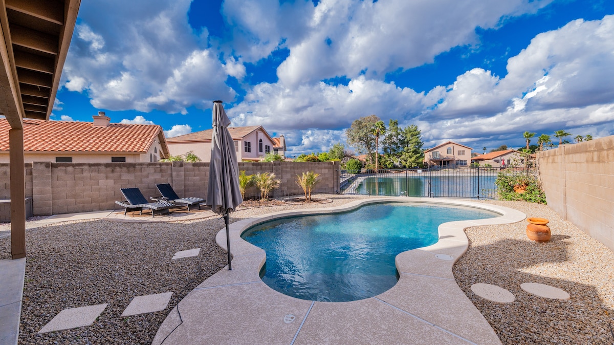Maging komportable sa maliwanag at komportableng bahay na ito na may lahat ng kailangan mo. 11 milya papunta sa State Farm Stadium. Malapit lang sa 101. Sipsipin ang iyong kape sa umaga at mga cocktail sa gabi habang natutuwa sa tahimik na tanawin kung saan matatanaw ang *lawa at paglubog ng araw. Maglaan ng oras sa labas ng pag - ihaw, magrelaks sa tabi ng fire pit o lumangoy sa pool. Maaaring magpainit ng POOL/SPA nang may bayad. Mga minuto sa maraming magagandang restawran, golfing, shopping at marami pang iba! I - explore ang Arizona! * Para lang sa pagtingin ang lawa