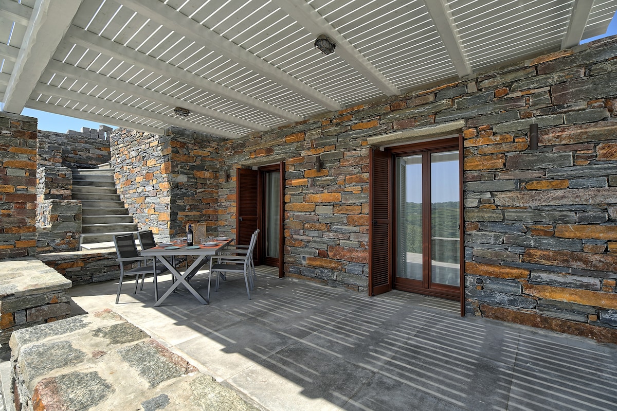 Isang magandang bahay - tuluyan na gawa sa bato, na nag - aalok ng mga modernong amenidad sa isang tradisyonal na setting. Kumpleto sa kagamitan para tumanggap ng 4 na bisita, mahusay na panukala para sa mga nakakarelaks na holiday. Nasa ground level ng isang villa na itinayo sa isang talampas sa isang tahimik na lokasyon sa kanayunan na nakatanaw sa tanawin at papunta pa sa dagat. Ang kaakit - akit na pag - areglo ng Ioulis ay nasa loob ng 4 na minutong biyahe mula sa isang lagay ng lupa. Matatagpuan sa gitna ng Kea na may madaling access sa karamihan ng mga beach ng isla. Walking distance sa isang groceries market at isang tavern
