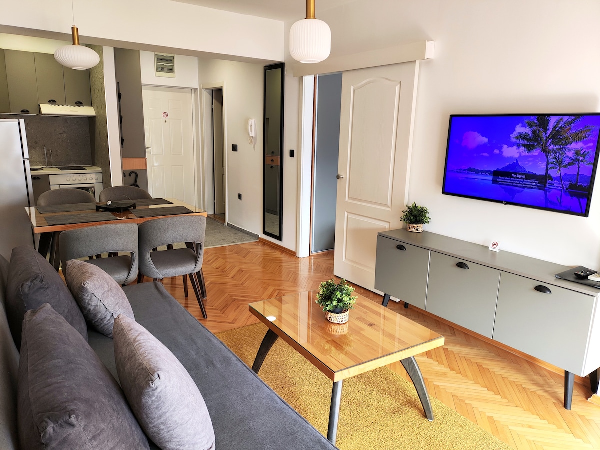 Perpektong Lokasyon. Modernong Disenyo. Bagong Apartment. KASAMA sa presyo ang LIBRENG Paradahan. Isa itong bagong komportableng apartment kung saan puwede mong i-enjoy ang bakasyon mo. Nasa gitna ng Ohrid ang lahat ng bagay na inilarawan namin sa seksyong "kapitbahayan." Humigit‑kumulang 100 metro ang layo ng Lake Ohrid, at 10 minutong lakad ang pinakamalapit na beach sa lungsod. 10 minutong biyahe ang layo ng central bus station, at 15 minutong biyahe ang layo ng Ohrid International Airport.